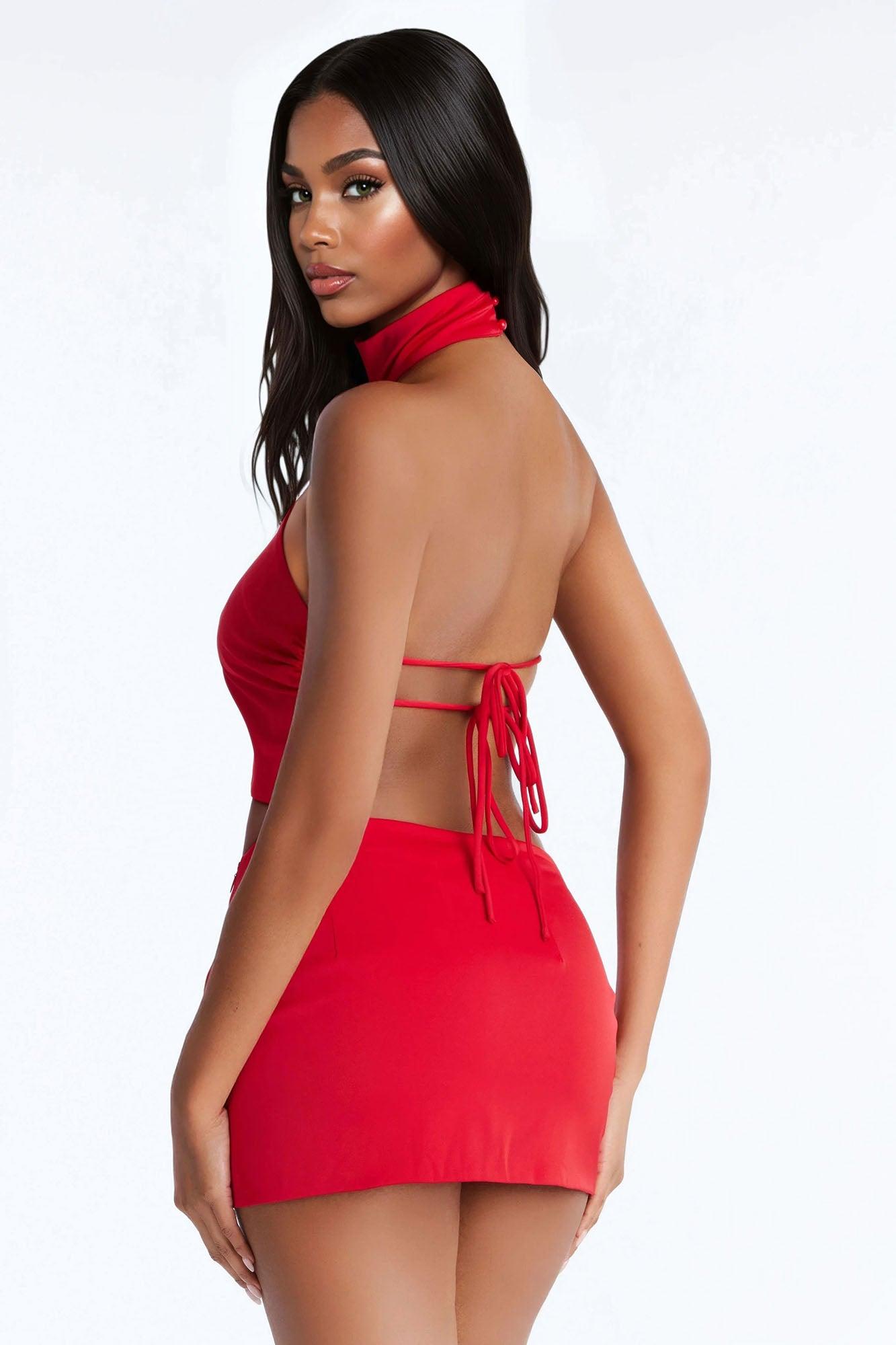 Available In Black And Red. Halter Top Satin Neck Button Closure Tie Back Backless Ruched Side Non Stretch Pair With "Kiss Me I'm Cute Bodycon Satin Mini Skirt" Self: 95% Polyester 5% Spandex Lining: 100% Polyester Imported