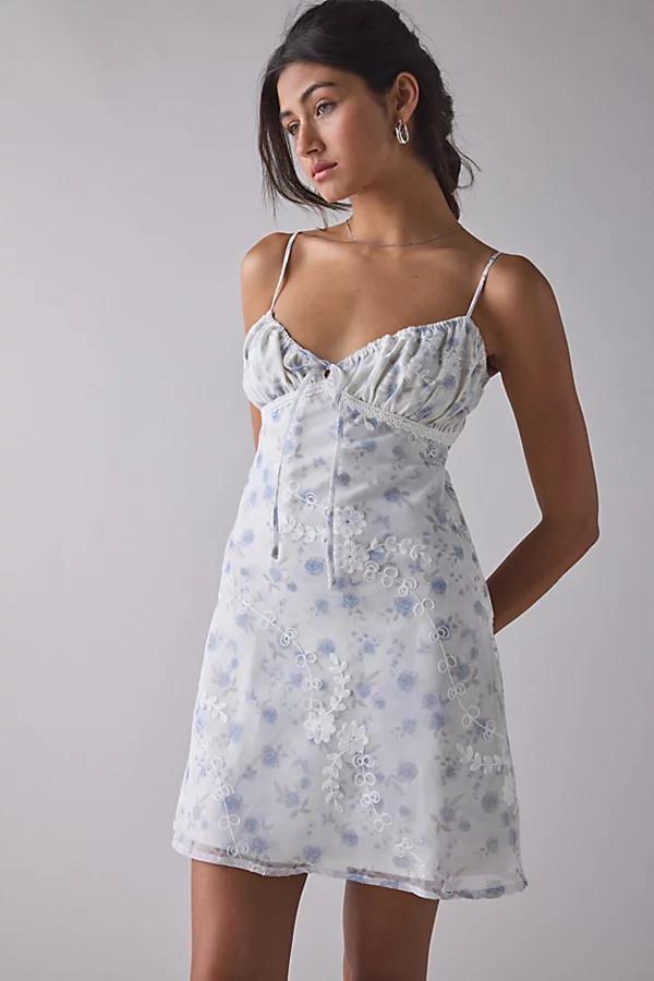 So sweet Kiss The Sky mini dress designed in a floral printed lace. Slip mini dress in a body-skimming silhouette featuring a plunging v-neckline, ruched bust with a tie-front detail and an empire waistline for a vintage vibe. Features Kiss The Sky floral lace tie-front slip mini dress Empire waist mini dress Plunging v-neckline and spaghetti straps Ruched bust with tie-front detail Empire waistline Slip fit Mini length Adjustable straps Lined Zip closure Content + Care 100% Polyester Machine wa