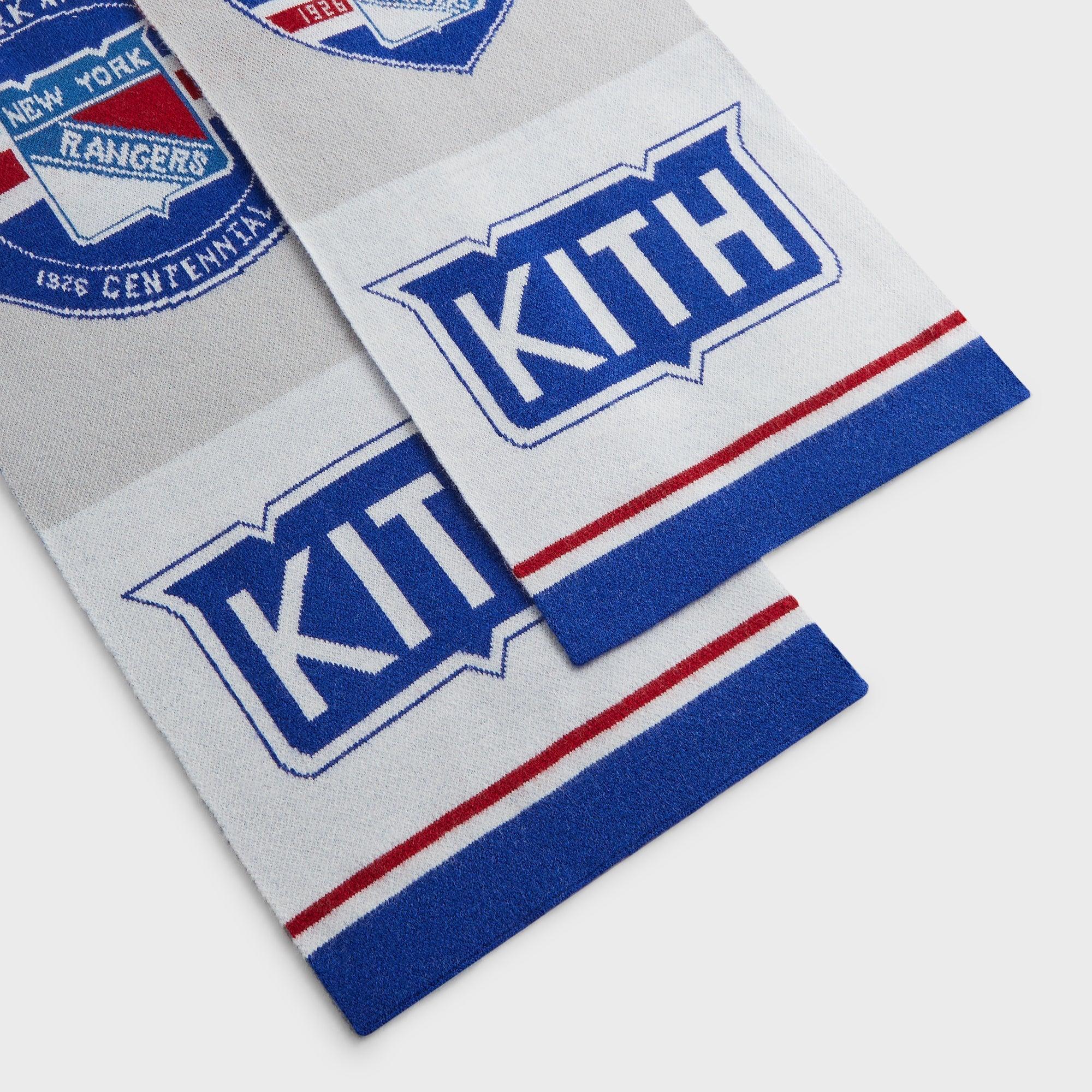 Acrylic blend New York to the World artwork on the front Kith branding near the edges Kith for the New York Rangers Centennial badge Dimensions: L 70.9" x W 9.4" Style: khm10120-002 Color: Light Heather Grey Material: 48% Acrylic / 42% Nylon / 10% Wool