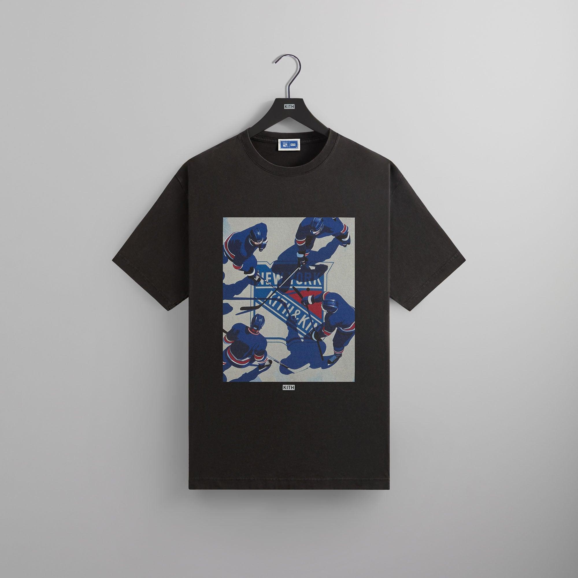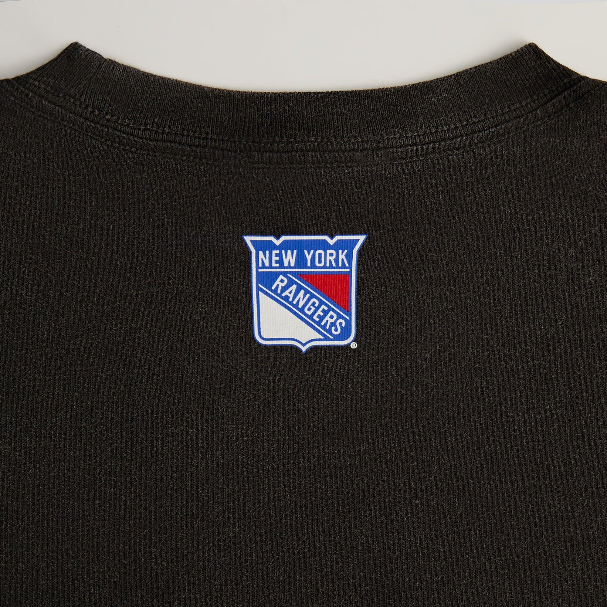 Available U.S. only 230GSM cotton jersey Vintage wash Ribbed neckline New York Rangers graphic printed on the front New York Rangers logo printed on the back Machine wash inside out Wash with like colors Style: khm033188-001 Color: Black Material: 100% Cotton