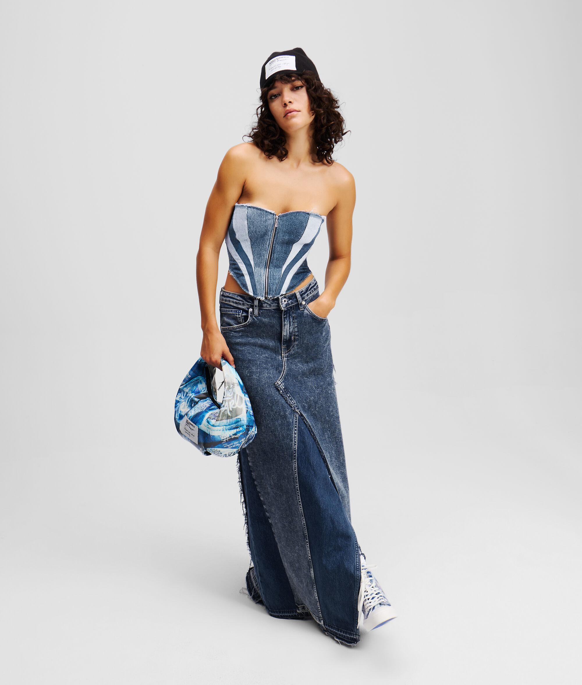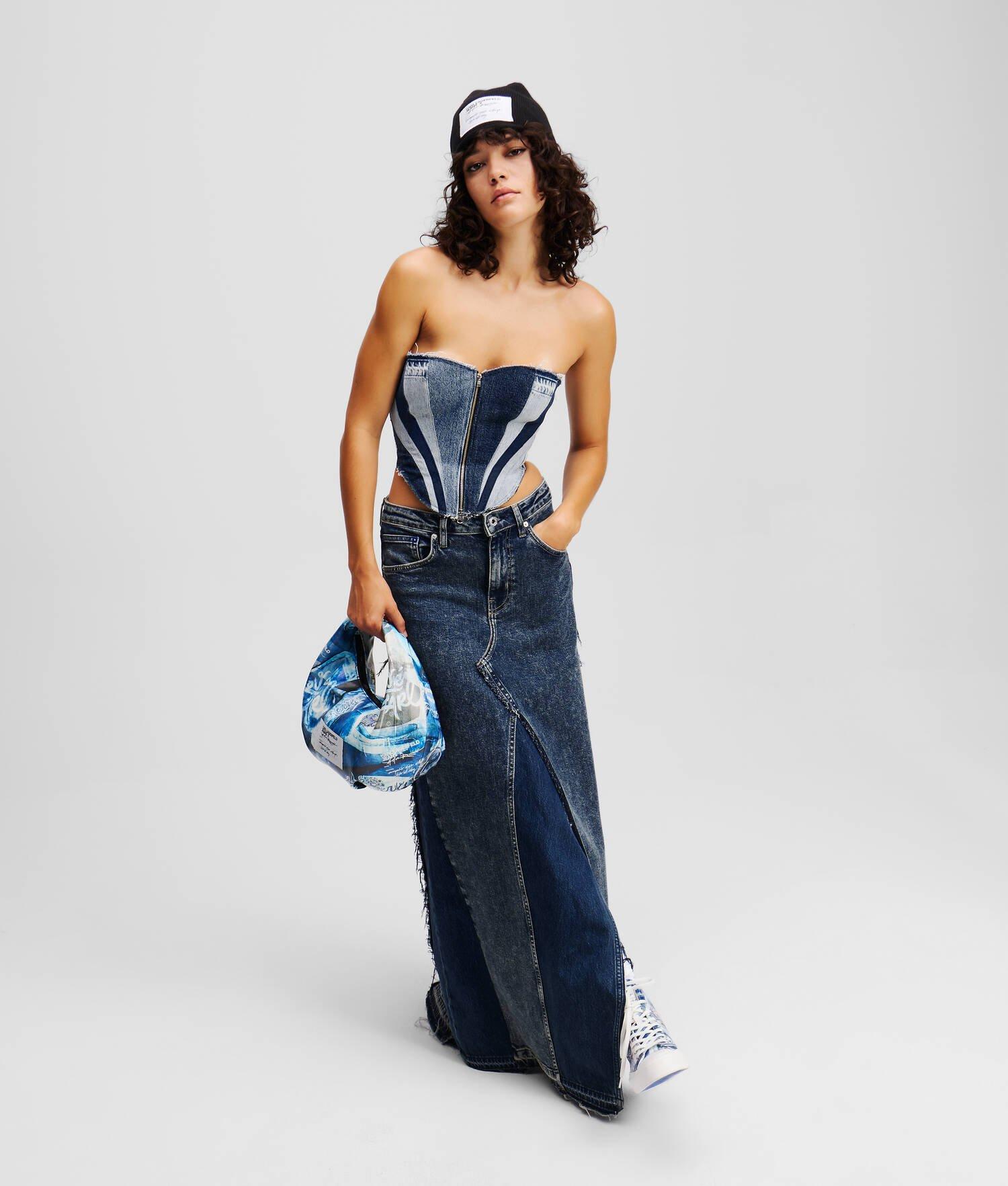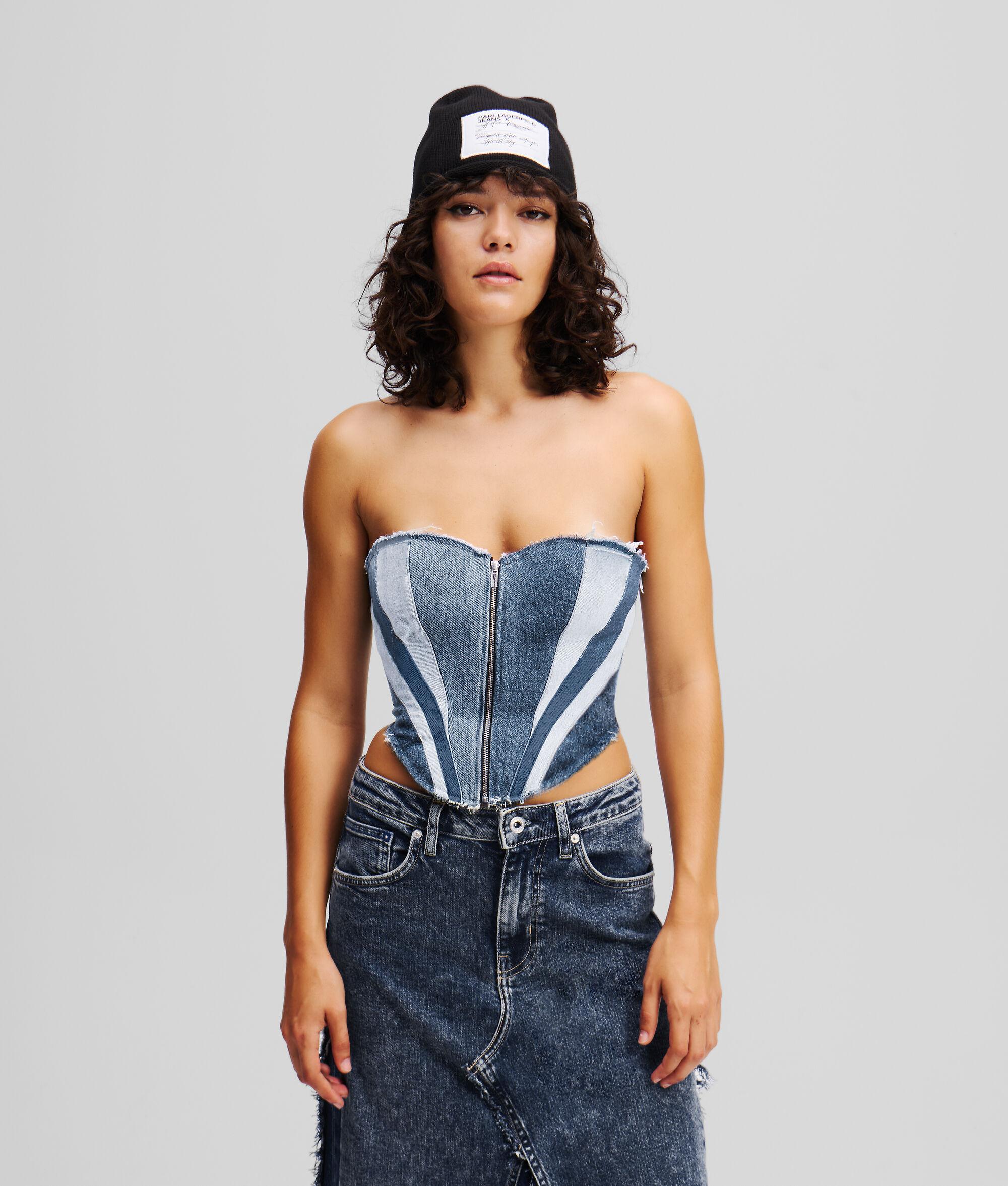 Take street style to the next level with this denim bustier, combining KARL LAGERFELD JEANS’ edge with the creative aesthetic of Amsterdam-based Atelier Reservé. A bold patchwork design with zip and drawcord details contrast with a figure-hugging corseted silhouette to create a standout addition to any outfit.