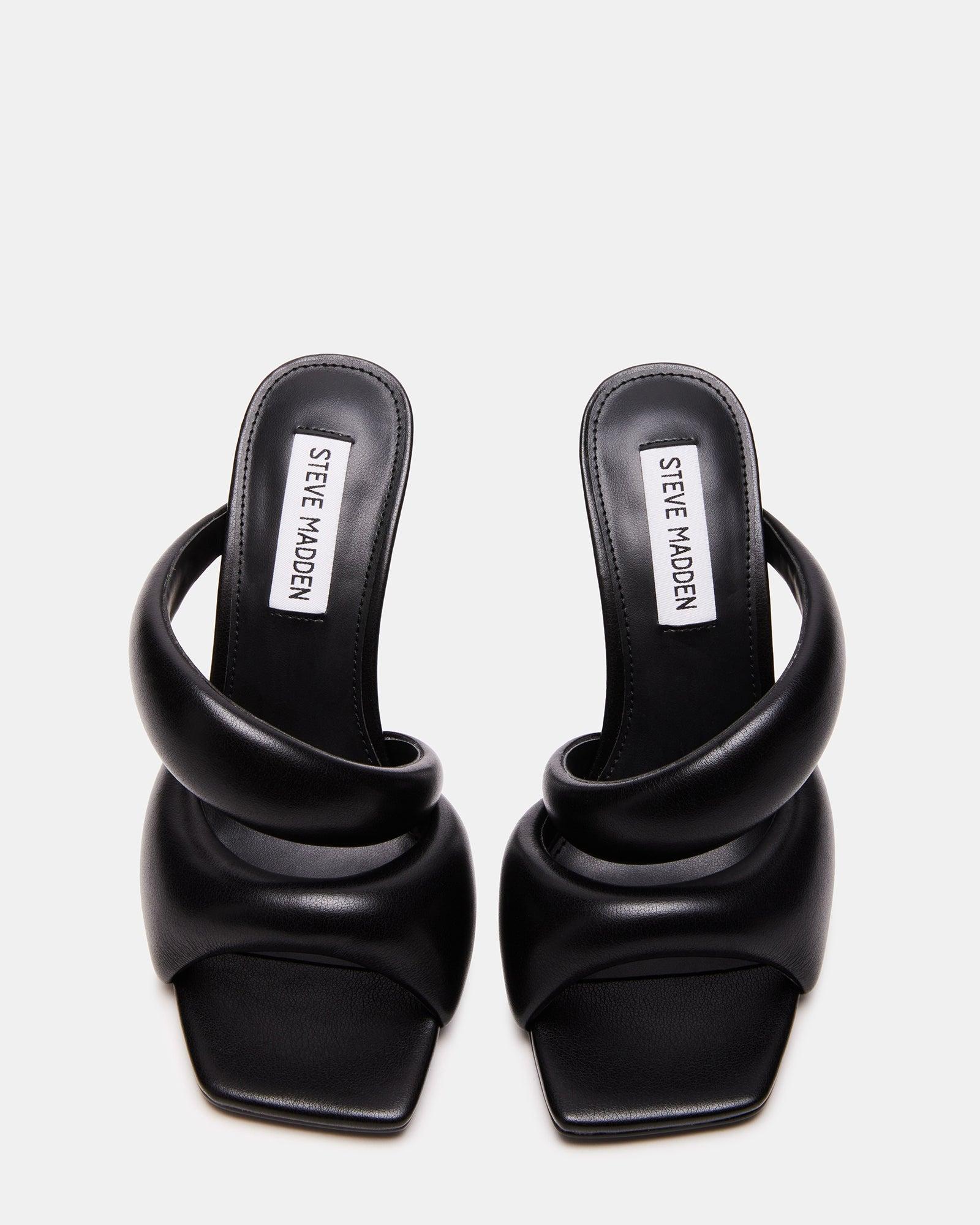 ELEVATED + DYNAMIC + CONTEMPORARY The KLOSS square toe slide matches an angled heel to sculptural puffed straps crossed over the foot to give this sandal design a rounded bubble silhouette. Square toe heeled slide sandal Slip-on style 2 puffy bubbled straps Mid-width angled heel 3.75 inch heel height Vegan leather upper material Vegan leather lining Vegan leather sock Synthetic sole Imported