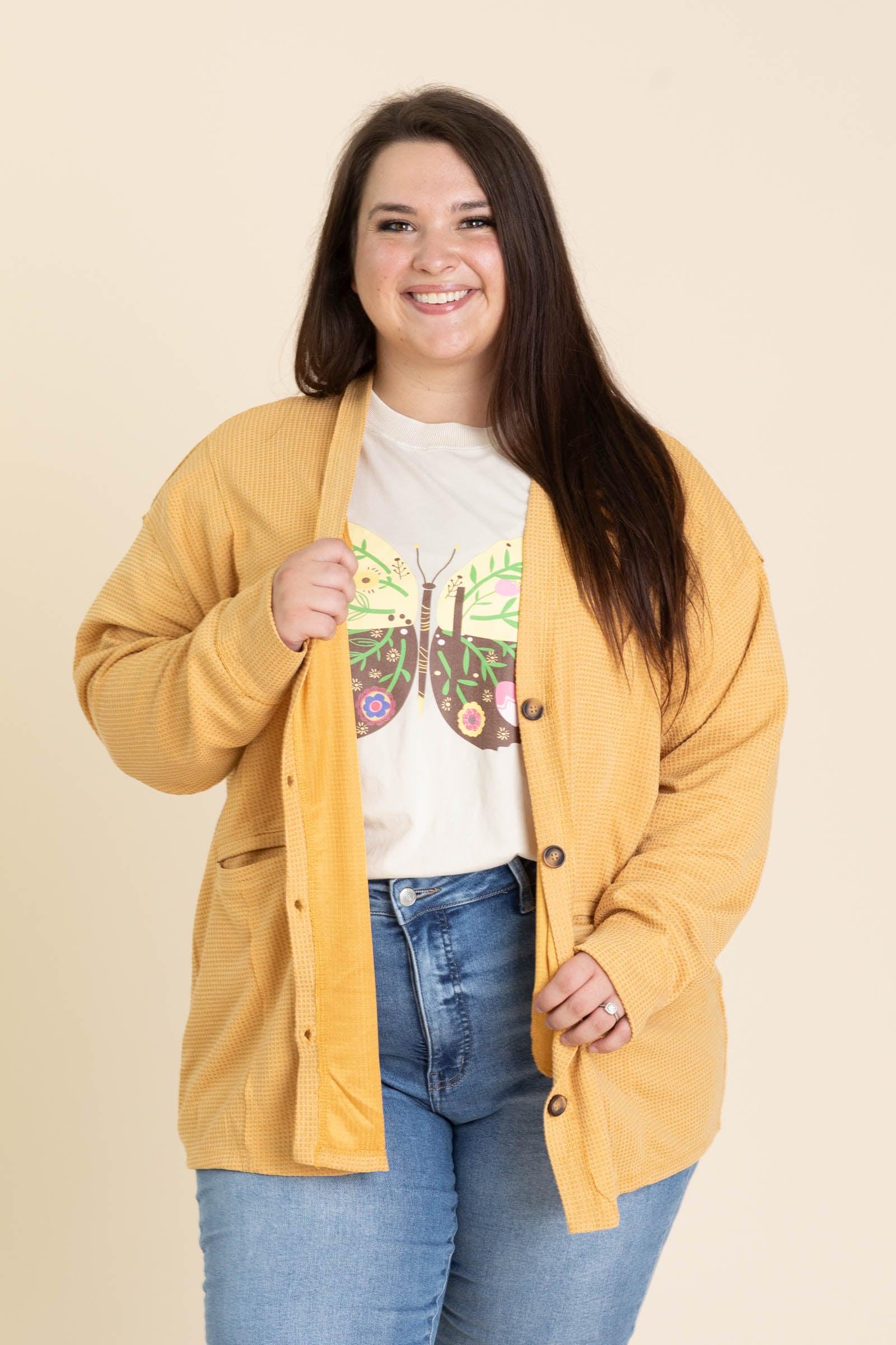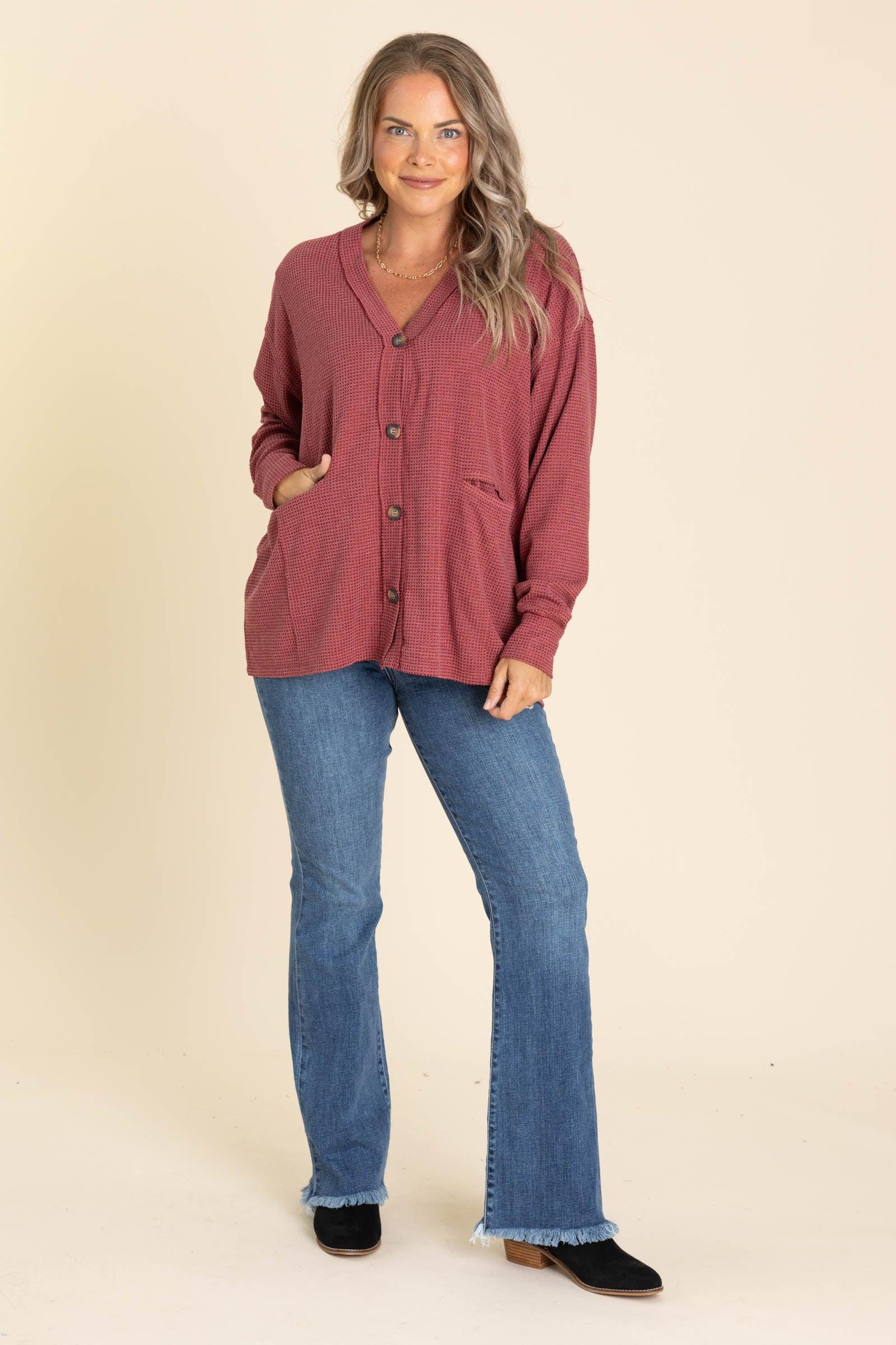 Product Details Colors: Black/ Chocolate/ Wine/ Rust/ Magenta/ Marigold/ Olive/ Jewel Green Print: Washed Waffle Knit Neckline: V-Neck With Button Down Sleeve: Long Sleeve Hemline: Straight Brand: Andree By Unit Material and Care 78% Polyester 18% Rayon 3% Spandex Hand Wash Cold Hang/ Line Dry Size and Fit Small: Bust 52" Waist 50" Length 28" Medium: Bust 54" Waist 52" Length 28.5" Large: Bust 56" Waist 54" Length 29" 1X Large: Bust 58" Waist 56" Length 30.5" 2X Large: Bust 60" Waist 58" Length 31" 3X Large: Bust 62" Waist 60" Length 31.5" Erica is 5’7” and wearing her true size small