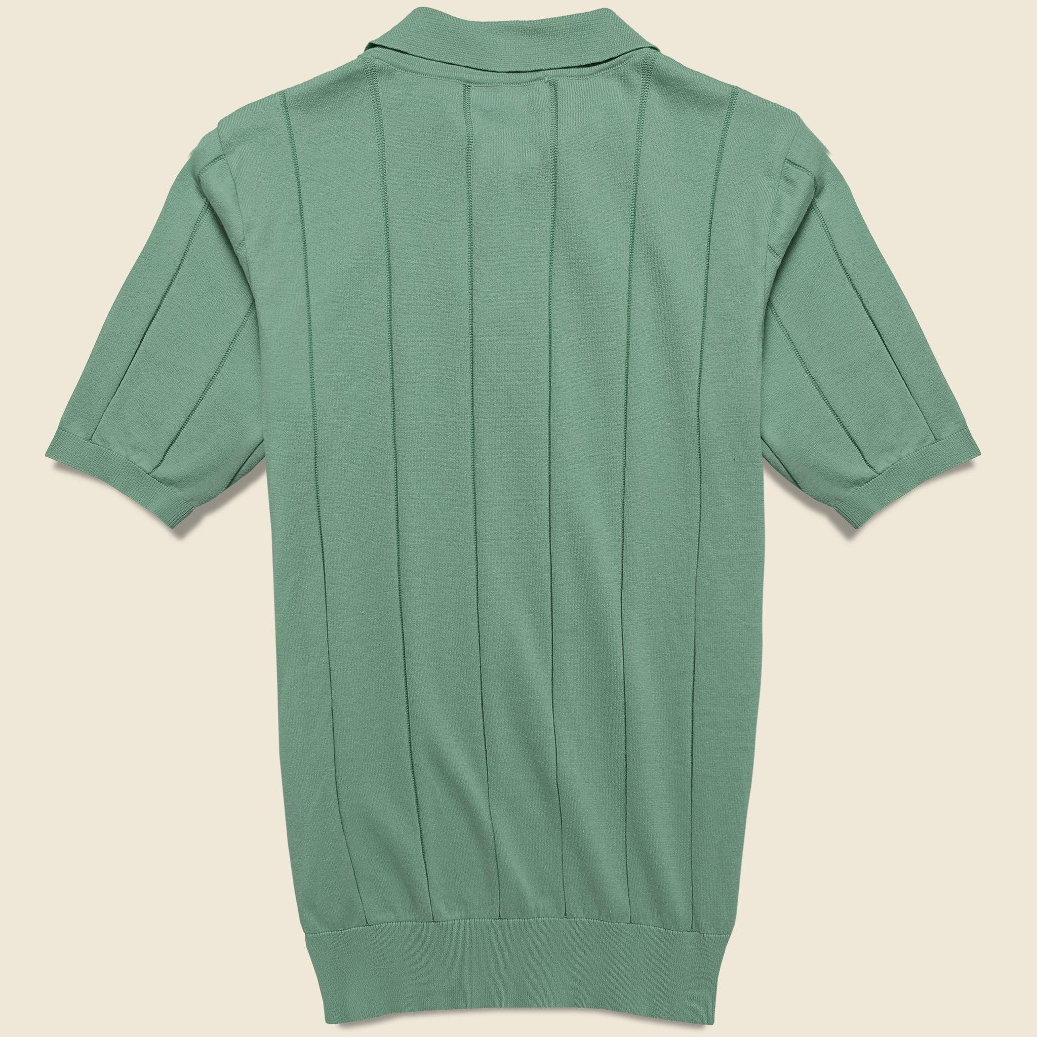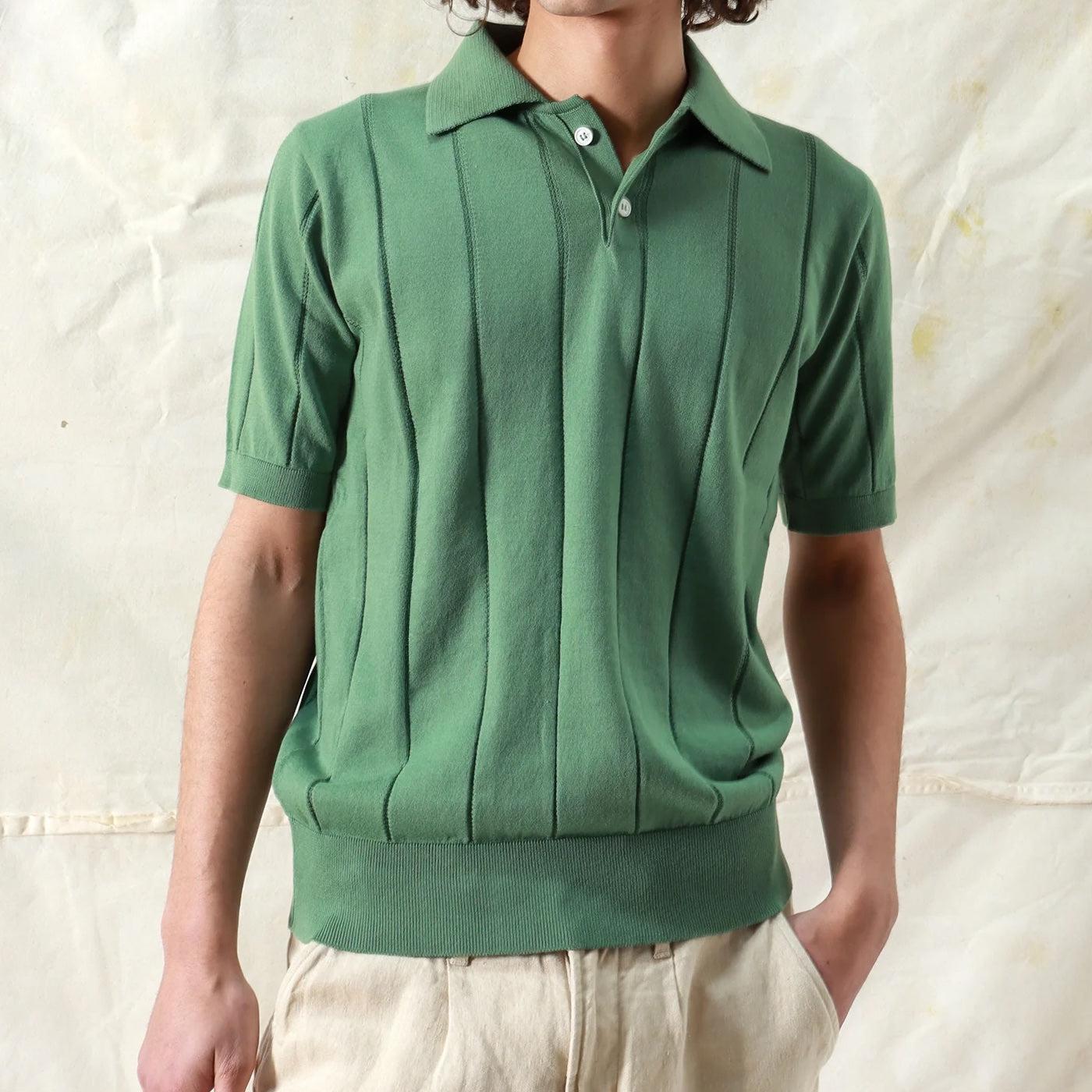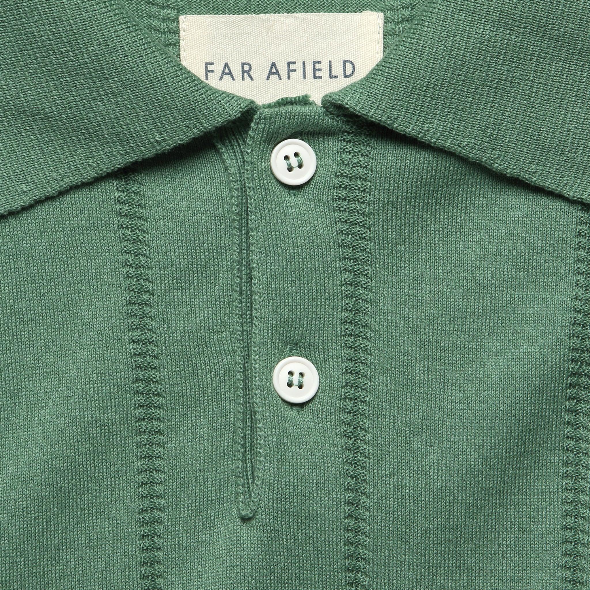 The Knit Jacobs Polo from Far Afield features a textured knit stripe in a classic midweight cotton to give it a genuine Ivy League prep style. Finished with a ribbed hem that sits just below the waist, it’s detailed with a simple spread collar and a two-button placket to further dive into the classic midcentury feel. Midcentury-style polo Soft, midweight cotton Knit striped pattern Spread collar Two-button placket Slim cut through the sleeves that fall just above the elbow Straight hem that fits a little slimmer around the waist Slim fit that runs narrow through the chest We recommend taking your normal size for a slim fit or taking one size up for a more relaxed fit Materials: 100% cotton The following measurements are for size Medium: Chest: 36” | Shoulder: 15 ½“ | Sleeve: 17 ½” | Length: 25”