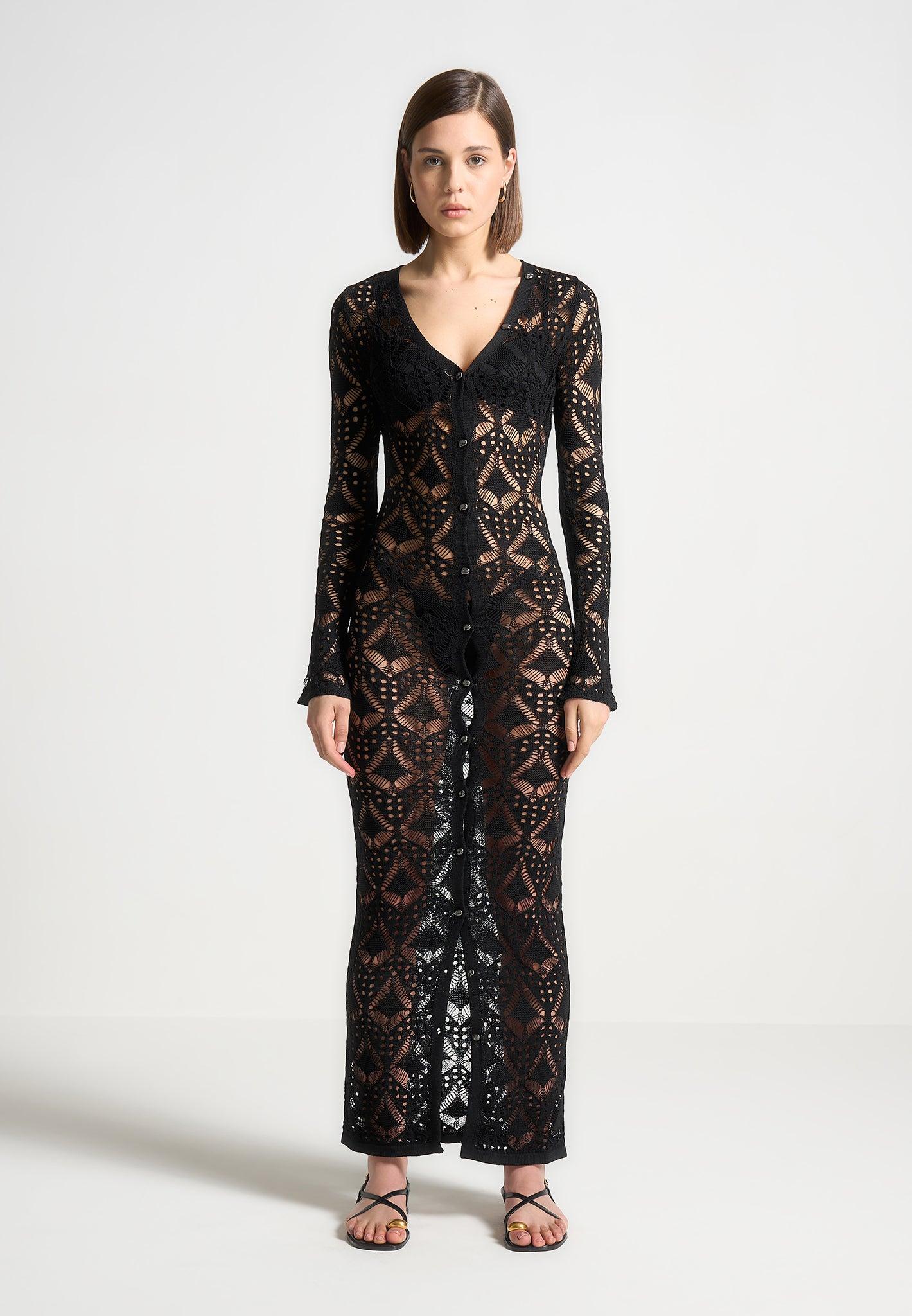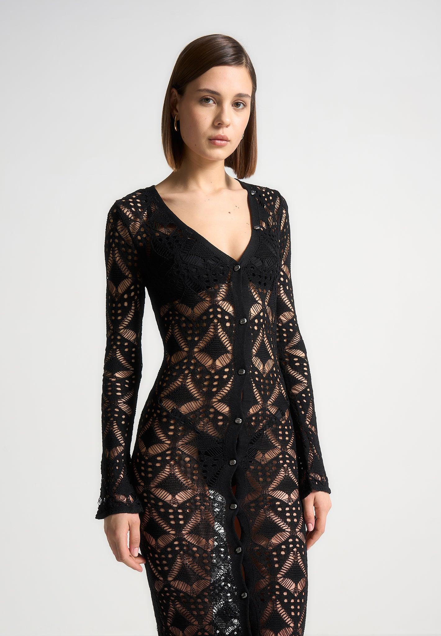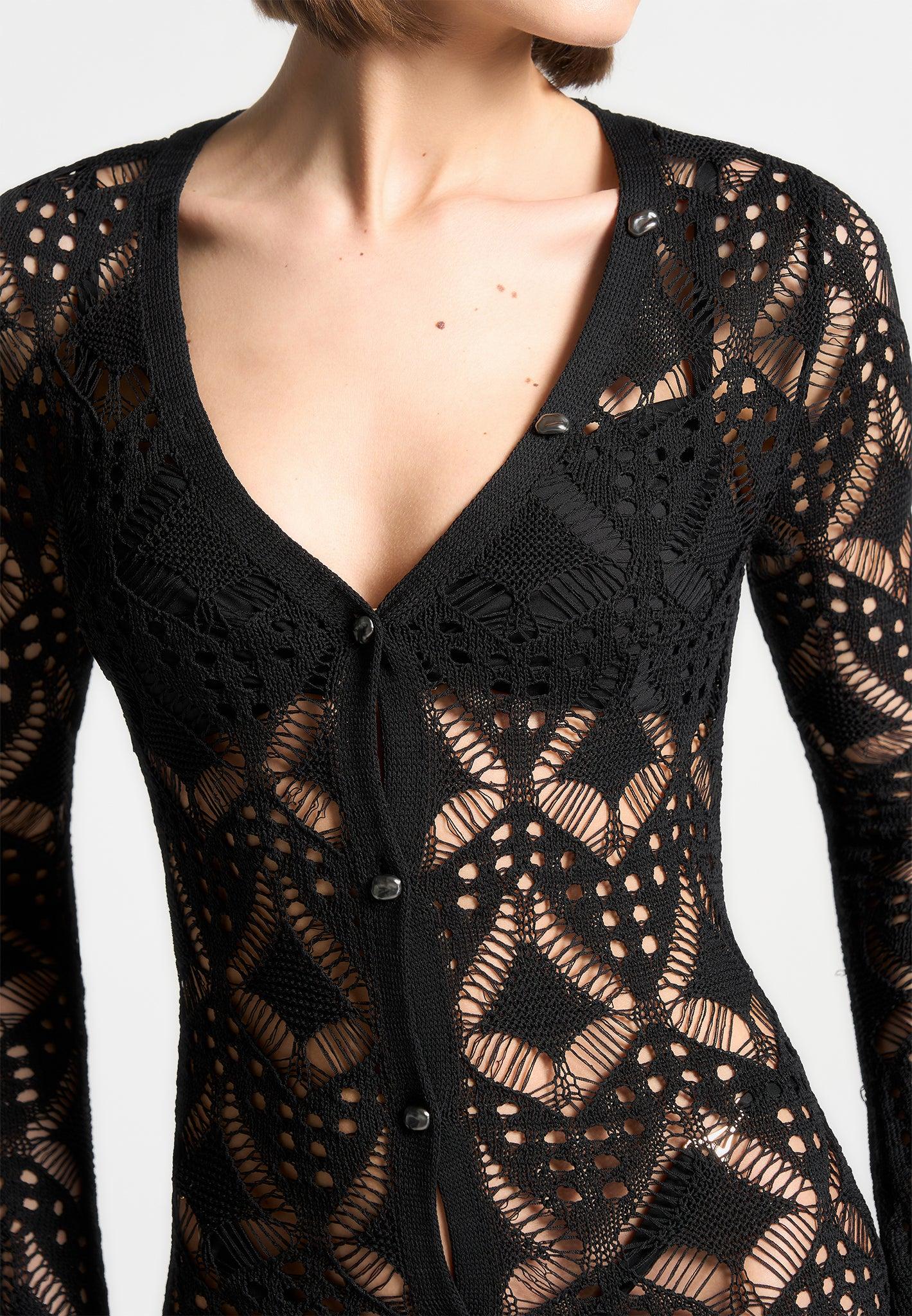 This black longline cover up is lightweight and perfect for a day at the beach. Featuring a button down design, it provides the perfect blend of style and comfort for your beach outings. Make a statement with this longline cover up. Fabric: Always check the care label for wash instructions. Model is 5'8", 32.5" Bust, 24" Waist, 32" High Hip, 37.5" Low Hip and Wears Size XS Based on Size XS - Front Length cm/in, Chest cm/in, Sleeve Length cm/in Stretch Factor - /3