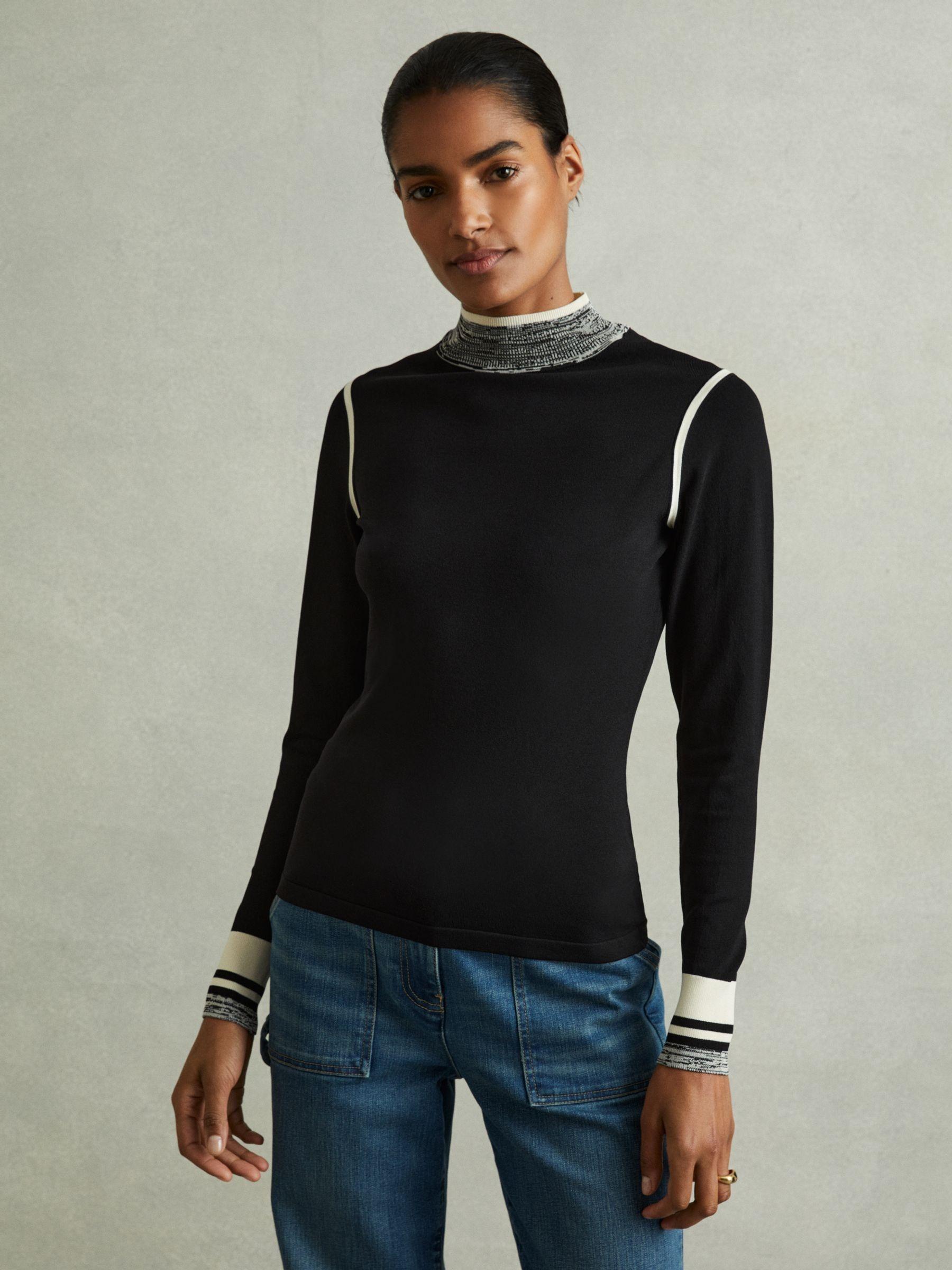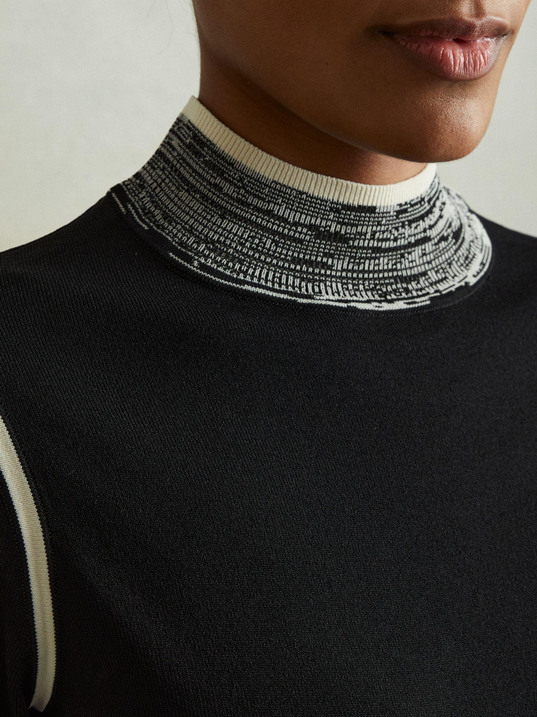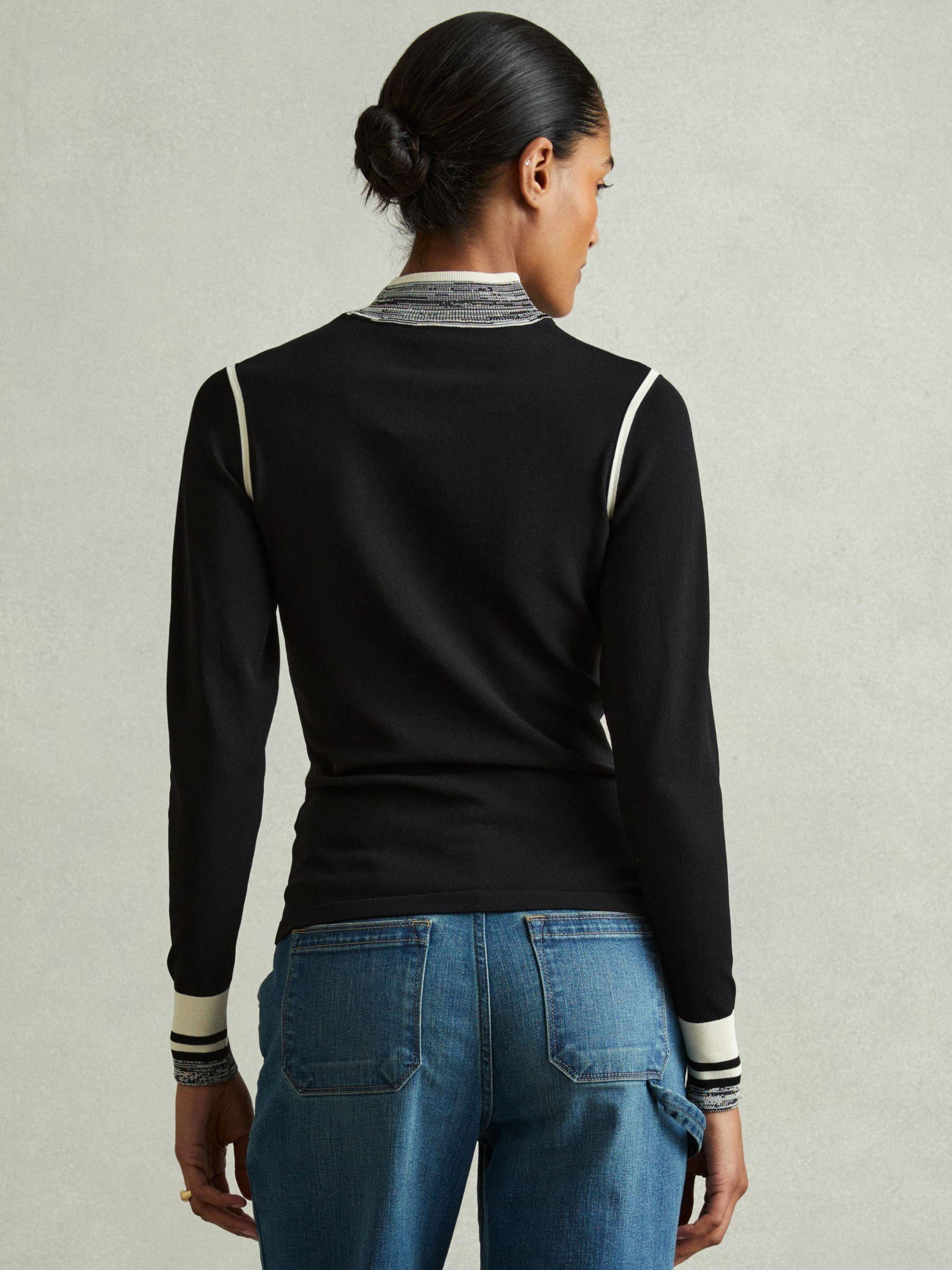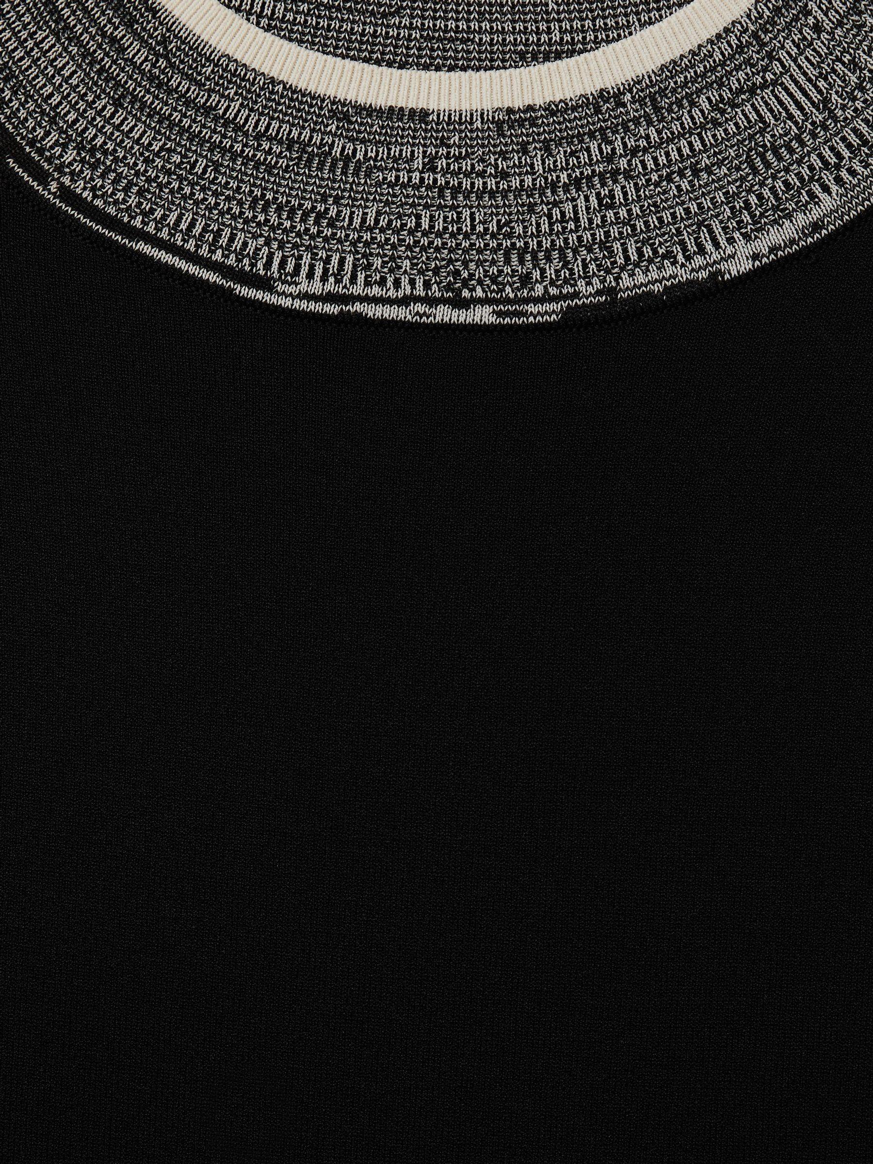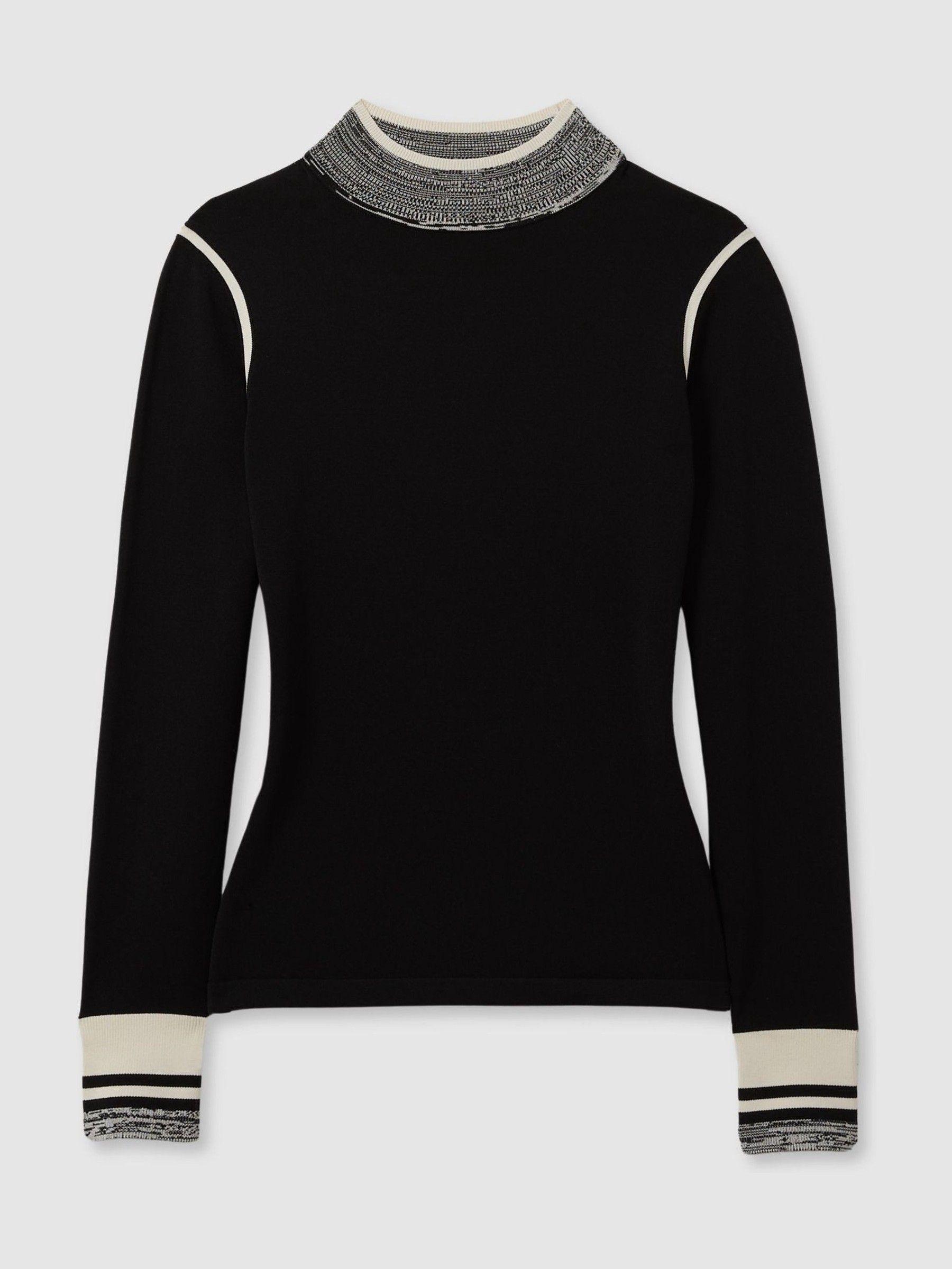 The Rosa is fitted through the figure, crafted from a textured knit yarn. Contrasting details feature to the neckline, arm holes, and cuffs, offering a new perspective on everyday knitwear. Knitted construction. Contrast detailing to neckline, arm holes, and cuffs Fitted.