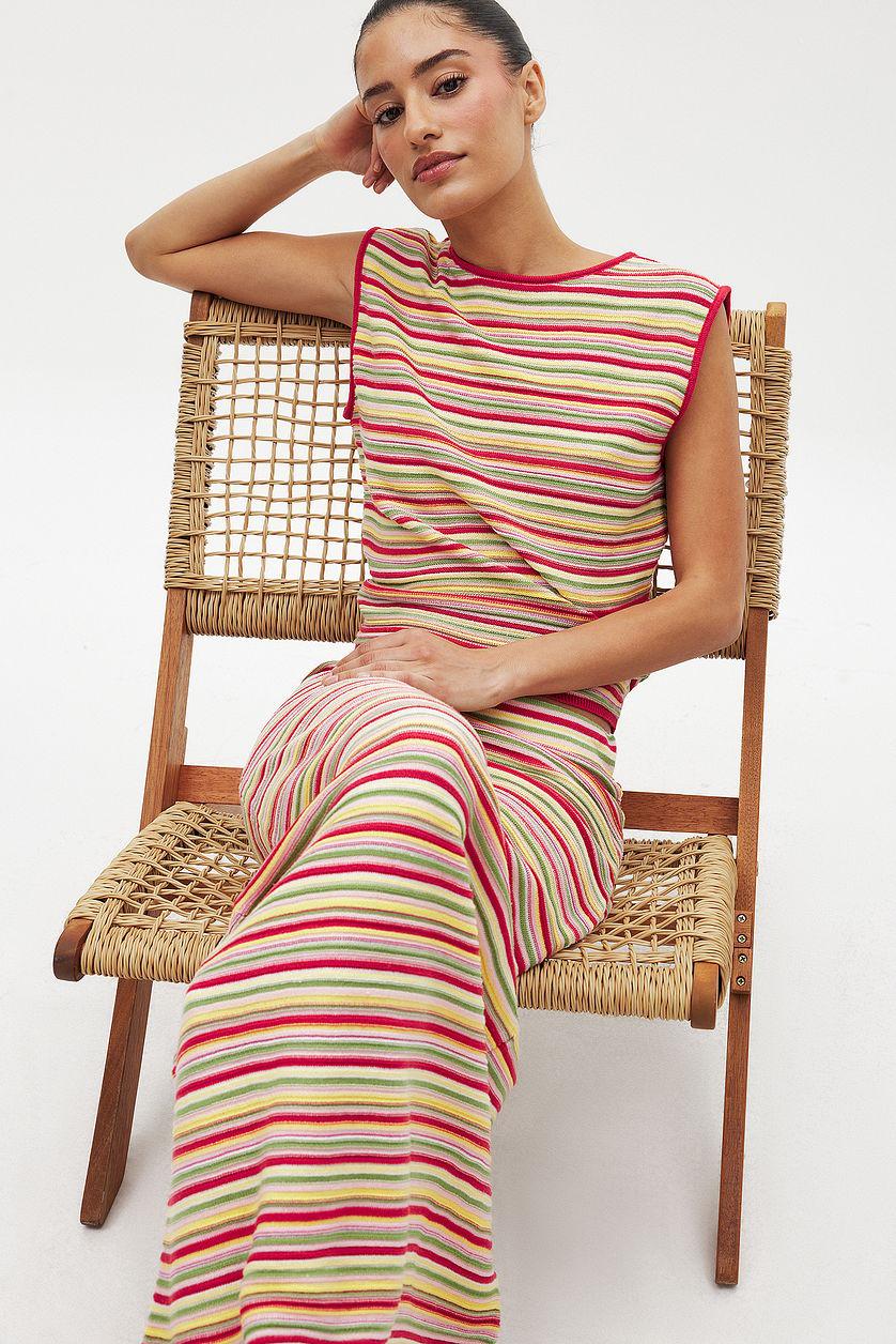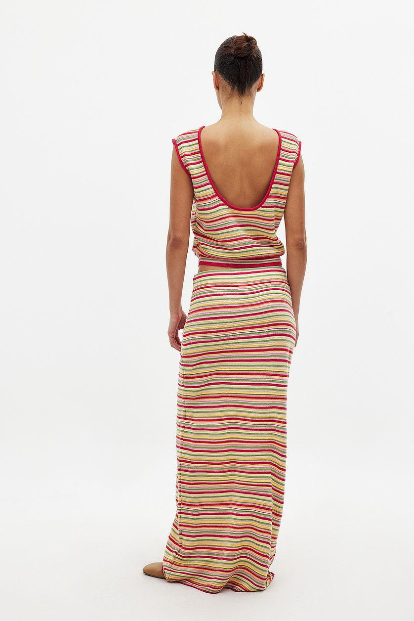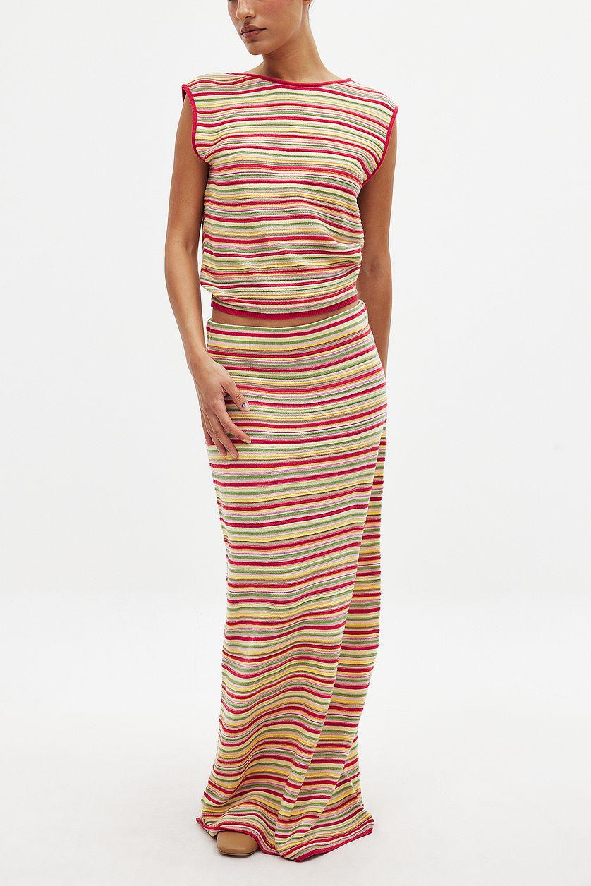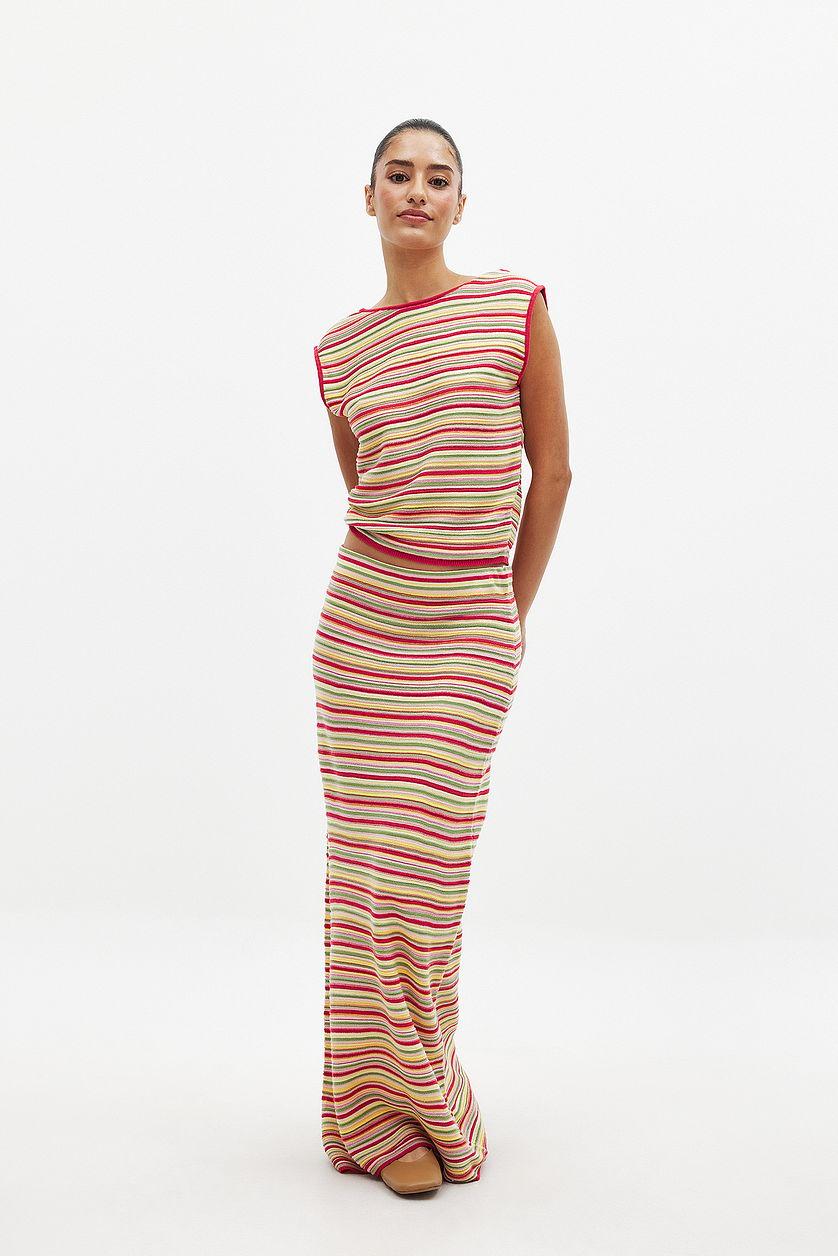This maxi skirt features a knitted design. It has a stretchy material and a form fit. The maxi skirt has a maxi length.