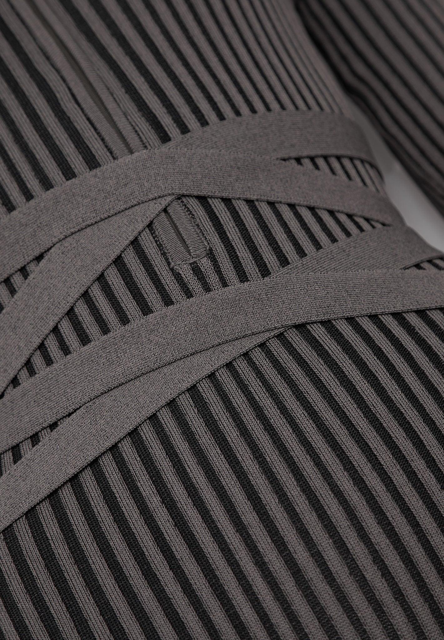 Grey/Black Knitted Two Tone Jumpsuit with BeltThe long belt tie elevates this jumpsuit to make it perfect for evenings out by wrapping around your waist numerous times to create a cinched waist. The knicker seam detail accentuates your bum to give a subtle hourglass illusion. Jumpsuit Silhouette Ribbed Knit Fabric Crew Neckline Corset Style Fastening Dipped Hem Concealed Zips at Hem Centre Front Zip Knicker Seam Detail Removable Tie Silver Manière De Voir Eiffel Plaque Fabric: 65% Viscose, 35% NylonAlways check the care label for wash instructions.