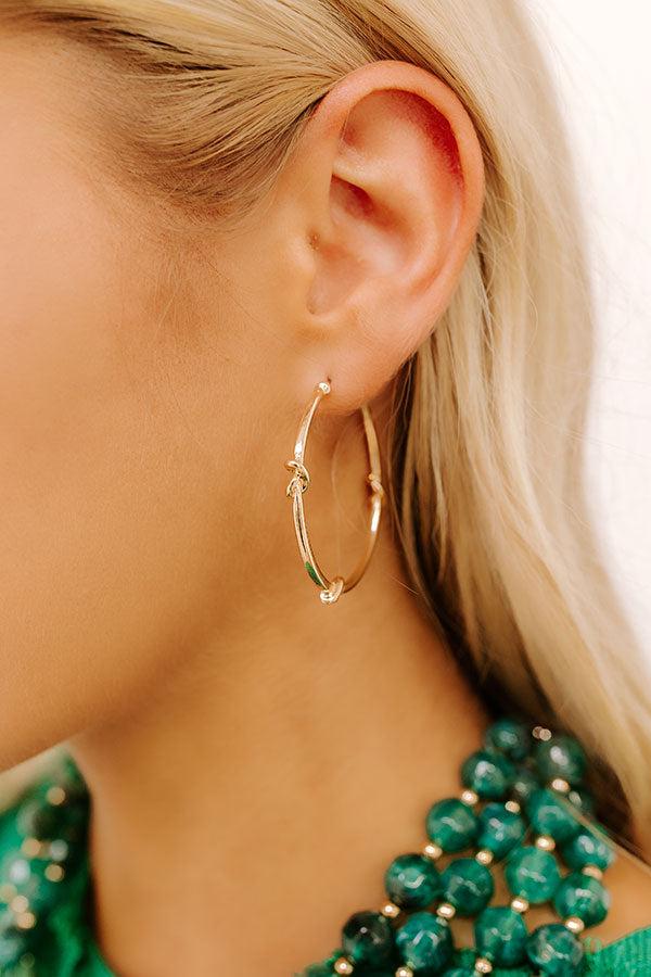 - These hoops are a little twist on timeless style! The knot detail adds the perfect trendy touch for effortlessly cute everyday looks. - Gold colored metal - Hoops with knot accents - Post backs - Size: 1.5 inches