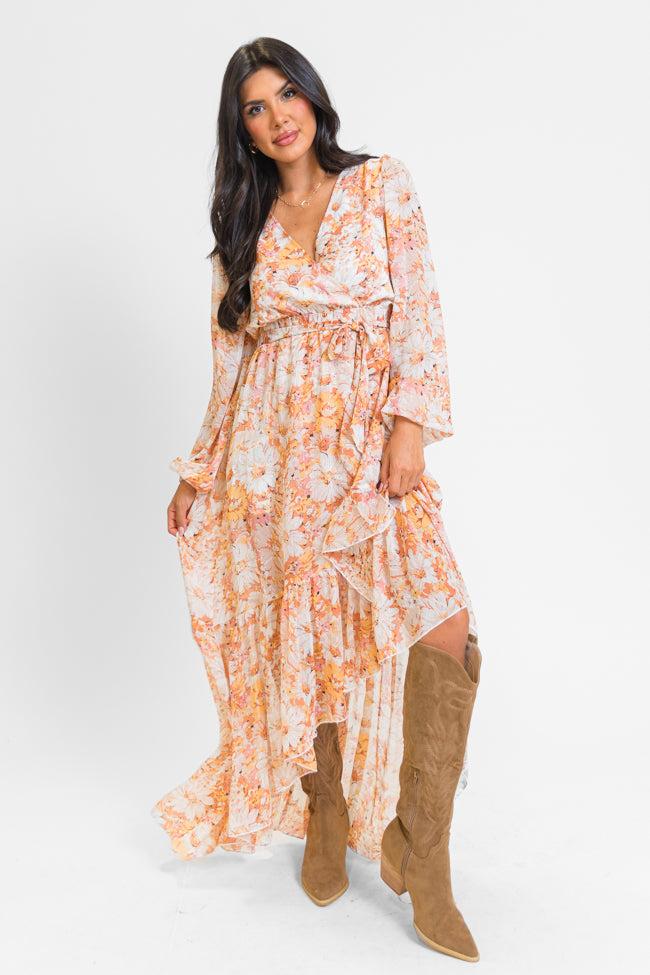Details Multi Floral Printed Long Sleeve Maxi Dress Fabric has no stretch V-neck with clasp closure, elastic waistband and sleeves, functional belt around waist Pair this dress with heels! Lined Size small from shoulder to hem: 57" Material and Care 100% polyester Machine wash cold, no drum drying Patterns may vary Materials may have natural variations Colors may vary from different viewing devices.