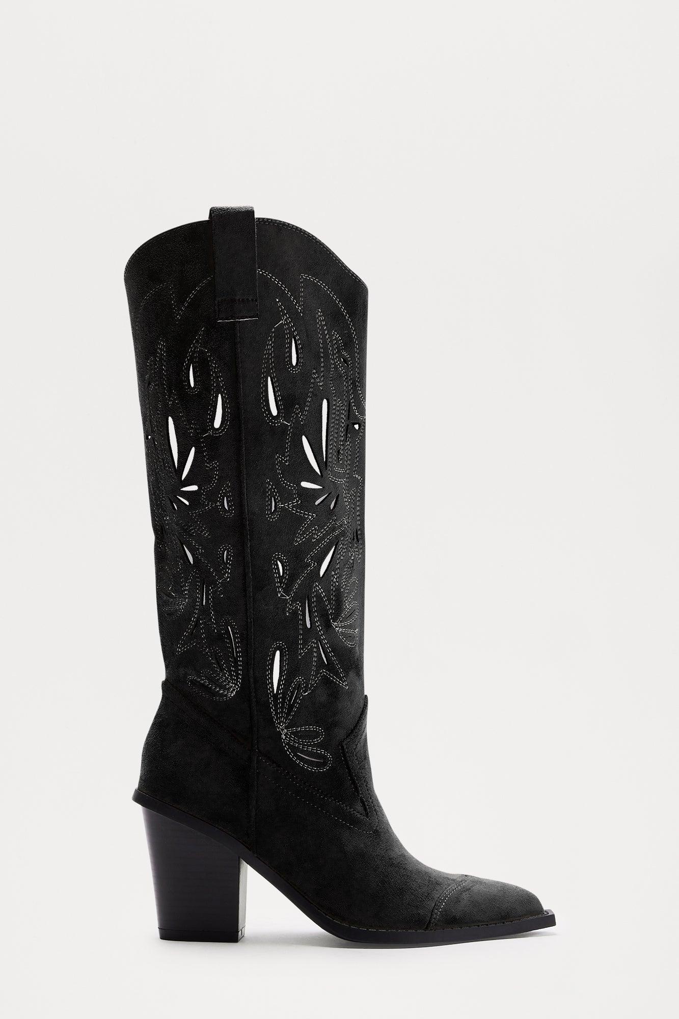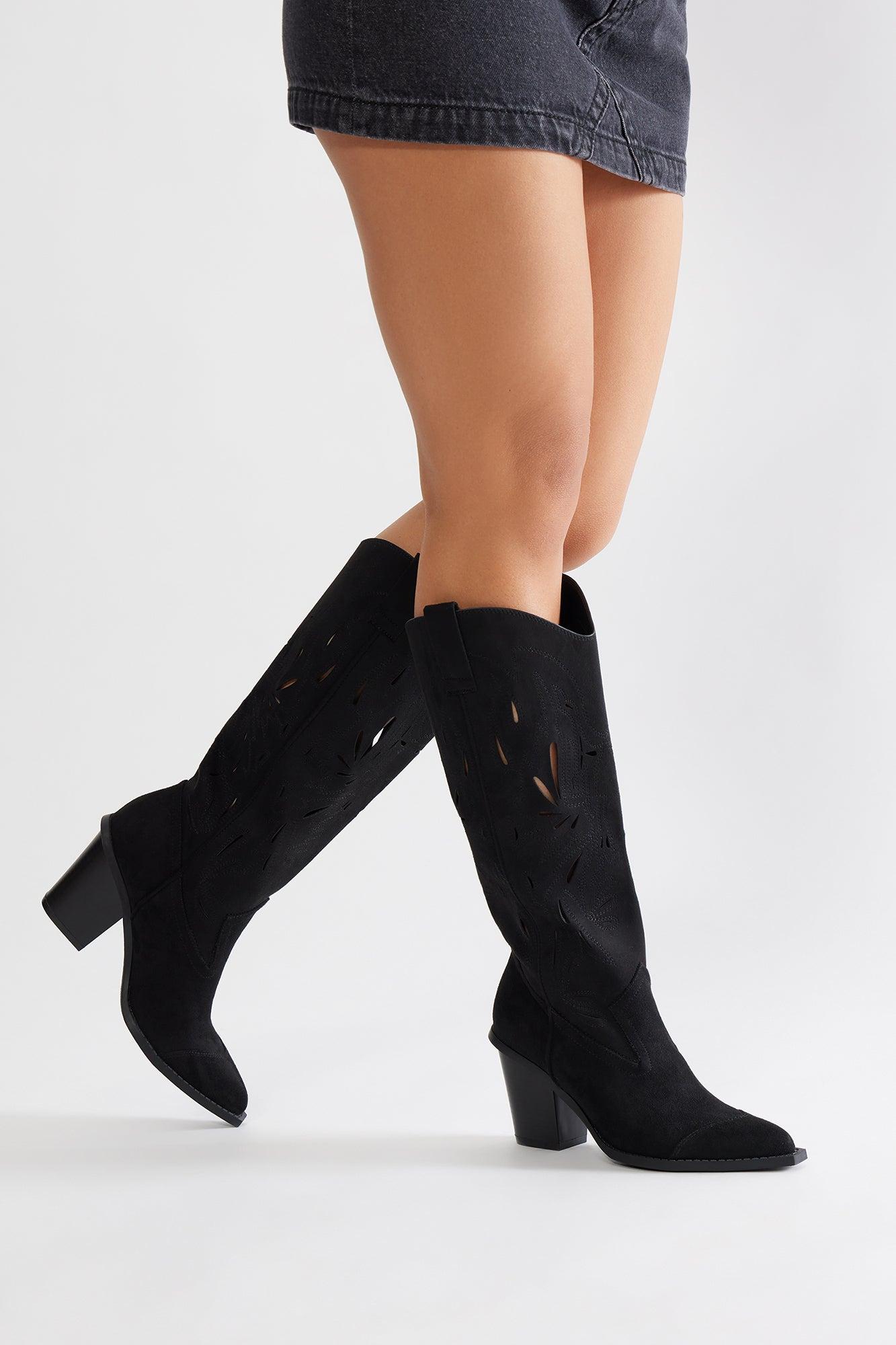 Available In Black And Taupe. Heeled Cowboy Boots Cutout Detail Pointed Toe 3.25" High Heel Block Heel Imported California Proposition 65WARNING: Cancer and Reproductive Harm - www.P65Warnings.ca.gov.