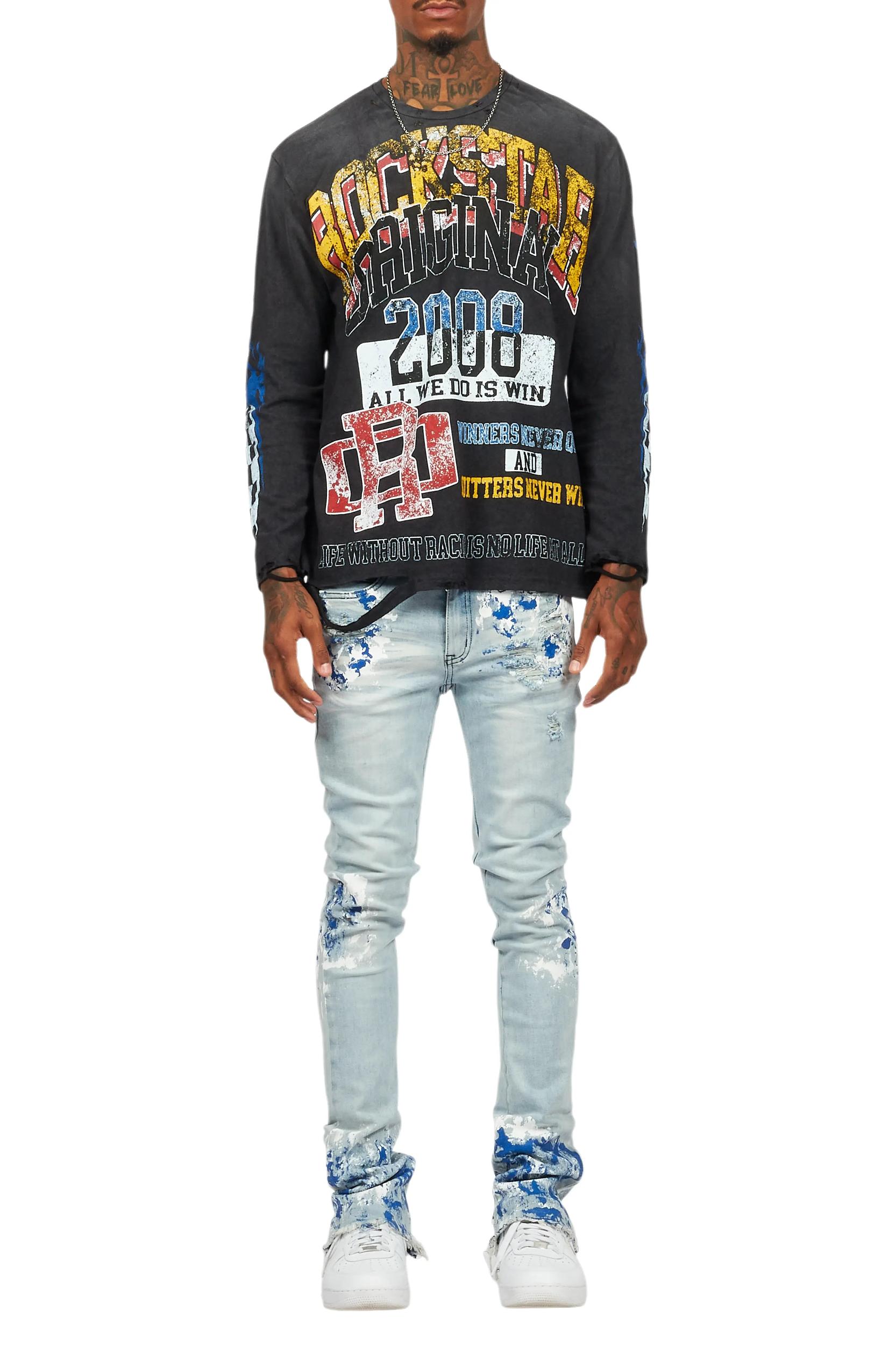 An urban stacked flare denim jean for men in blue. Designed with organic cotton and extra long legs for a must-cop streetwear staple piece. Zip fly with button closure 5-pocket build Bootcut silhouette Custom paint splatter Flared leg openings 35.75" seams *NOTE: These jeans are purposefully designed with extra long legs so the fabric properly bunches at the hem, creating the stacked flare style.