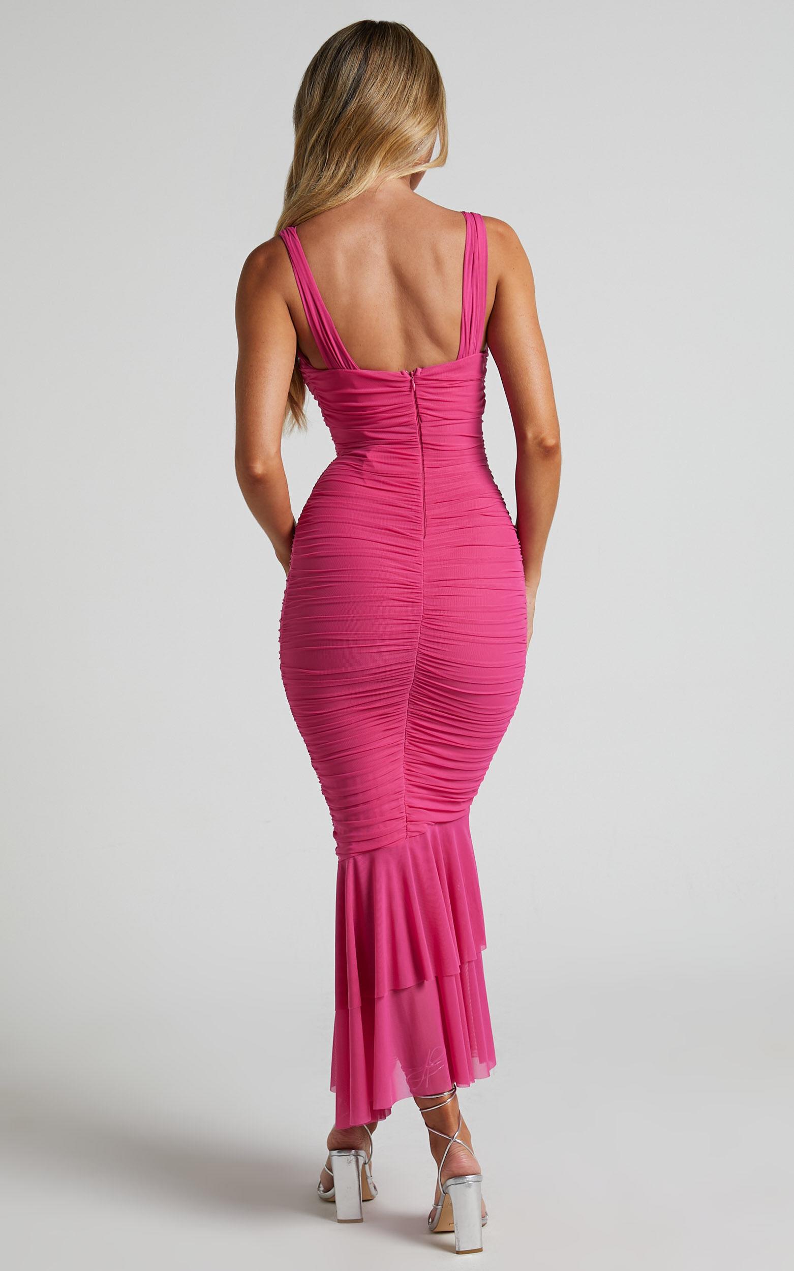 'Strut your stuff in the Kody Boydcon Ruched Mesh Cut Out Tiered Midi Dress - it's guaranteed to turn heads! This hot pink bodycon dress is perfect for a night out with the girls or a sophisticated cocktail event. The ruched detailing and cut-out design add a touch of sass that will make you feel confident and flirty all night long. Plus, the midi length makes it easy to show off those killer heels while still keeping things classy. Get ready to slay in this must-have piece from Showpo!'