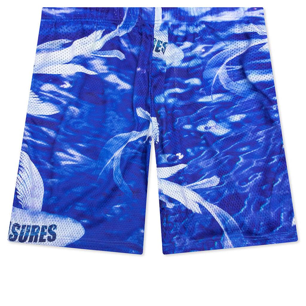 Pleasures introduces the Koi Mesh Shorts in its latest collection. Crafted from polyester mesh, these shorts are lightweight and breathable. Featuring vibrant koi fish graphics that are sublimation-printed, ensuring a long-lasting design that wont fade over time. The look is completed with an elastic waistband with adjustable drawstring, side pockets and a rear pocket. 100% Polyester Mid-weight mesh jersey fabric Elastic waistband Adjustable drawstring Side-seam pockets Rear patch pocket Sublimation-printed design Style no: P25SU031-BLUE P25SU031 BLUE
