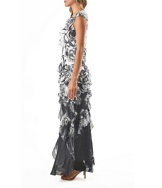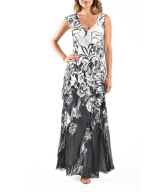 Komarov Charmeuse Chiffon Floral Print V Neck Sleeveless Ruffle Sheath Maxi Dress