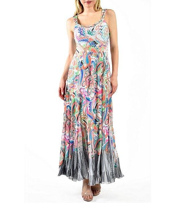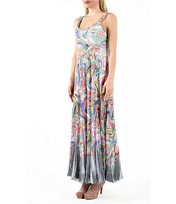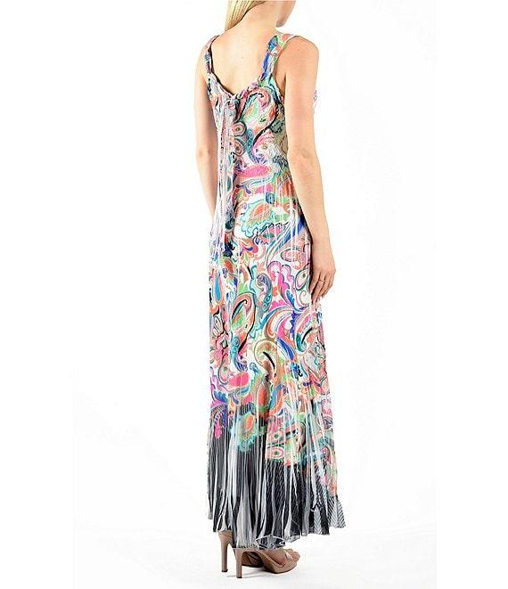 Komarov Chiffon Charmeuse Pyramid Pleated Paisley Print Scoop Neck Sleeveless Dress