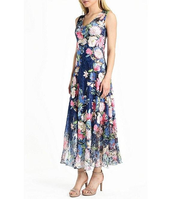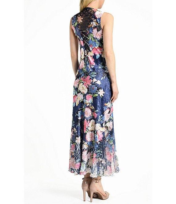 Komarov Floral Print Charmeuse V-Neck Sleeveless Lace Detail Maxi Dress
