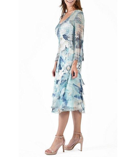 Komarov Floral Scoop Neckline Long Sleeve Pleated Charmeuse Dress