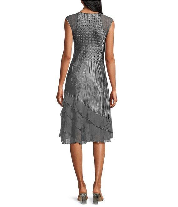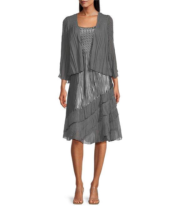 From Komorav, this jacket dress features: Jacket: Open front silhouette Chiffon fabrication 3/4 sleeves Pull-on construction Approx. 28" length Polyester Hand wash Dress: Aline silhouette Mixed media fabrication V-neckline Sleeveless Charmeuse satin bodice Chiffon ruffle detail Pull on construction Approx. 45" length Polyester Hand wash Imported.