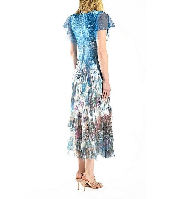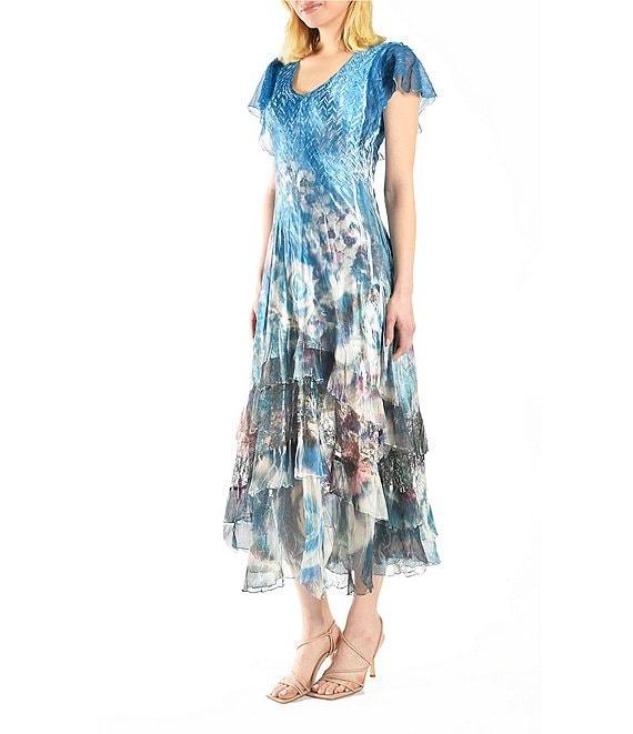From Komarov, this dress features: Mixed media fabrication Sheath silhouette Floral print V-neckline Short ruffle sleeves Ruffle detail Small pyramid accordion pleating Lace trim at hemline Fitted fit Fully lined Flutter hemline Pullover construction Approx. 57" length Polyester Hand wash Made in USA.