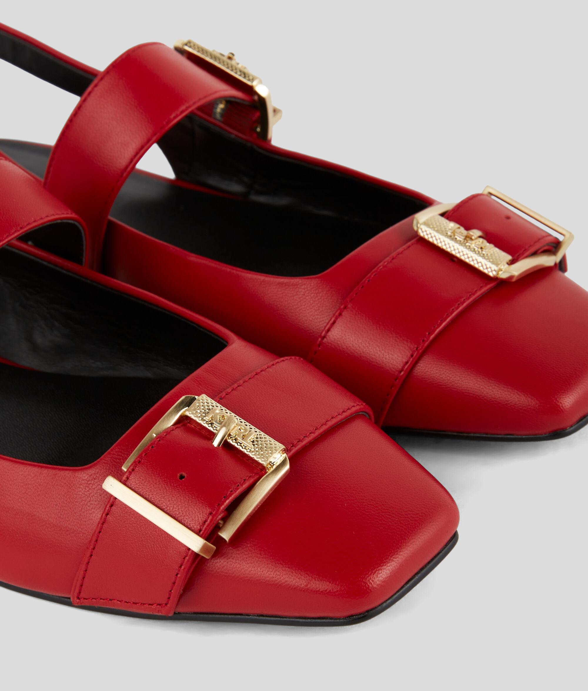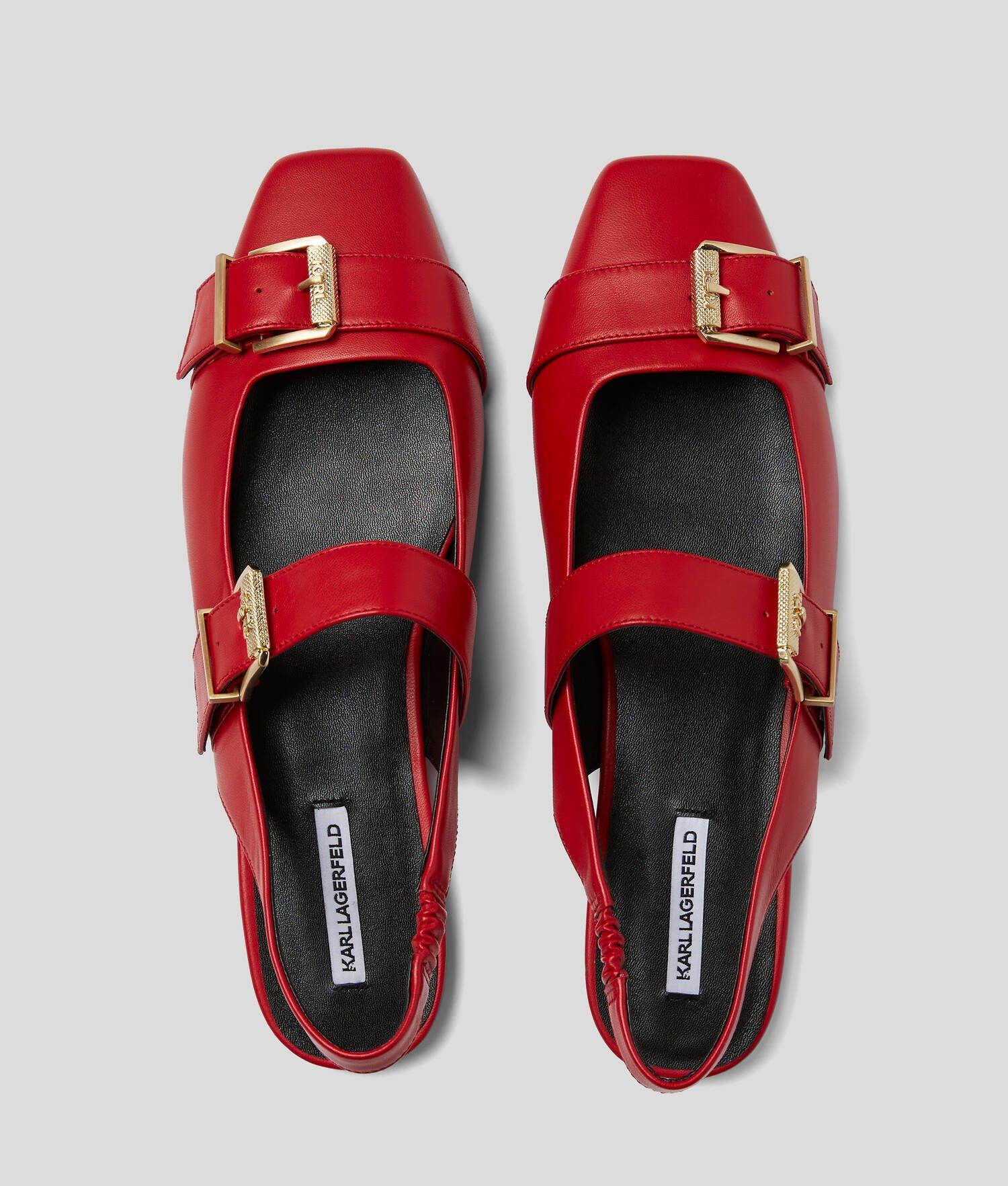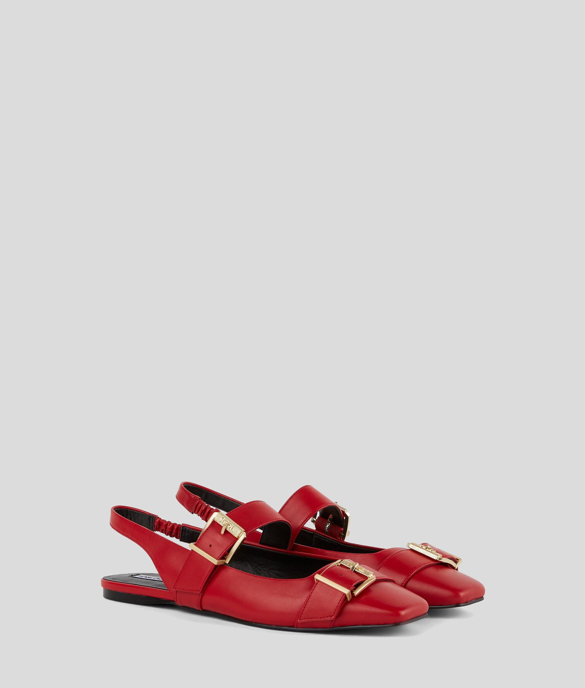 Step into edgy elegance with these sleek leather flats. The slip-on design, complete with elasticated slingbacks and a rounded toe, ensures comfort while statement double buckle detailing adds a touch of modern style.