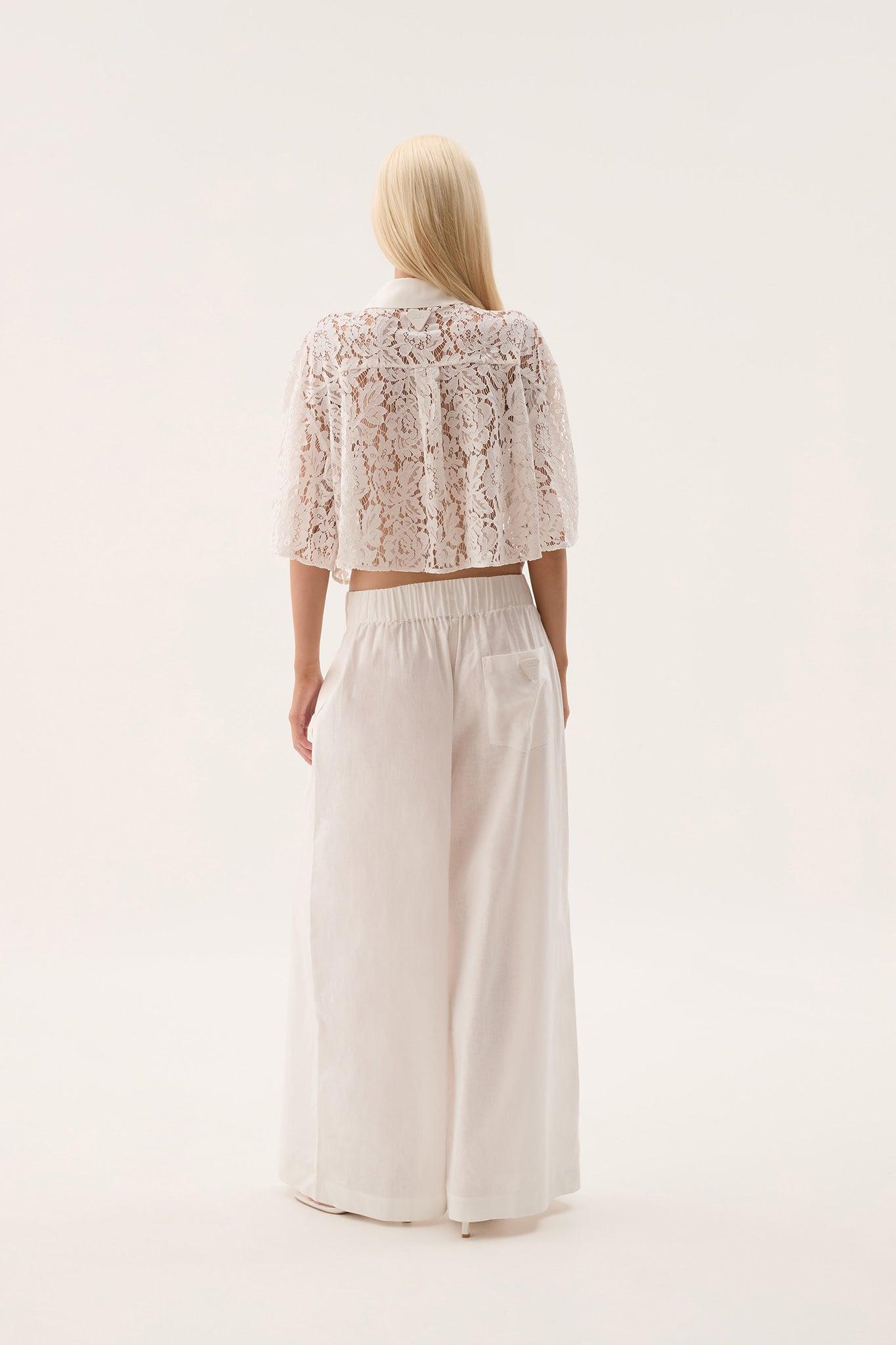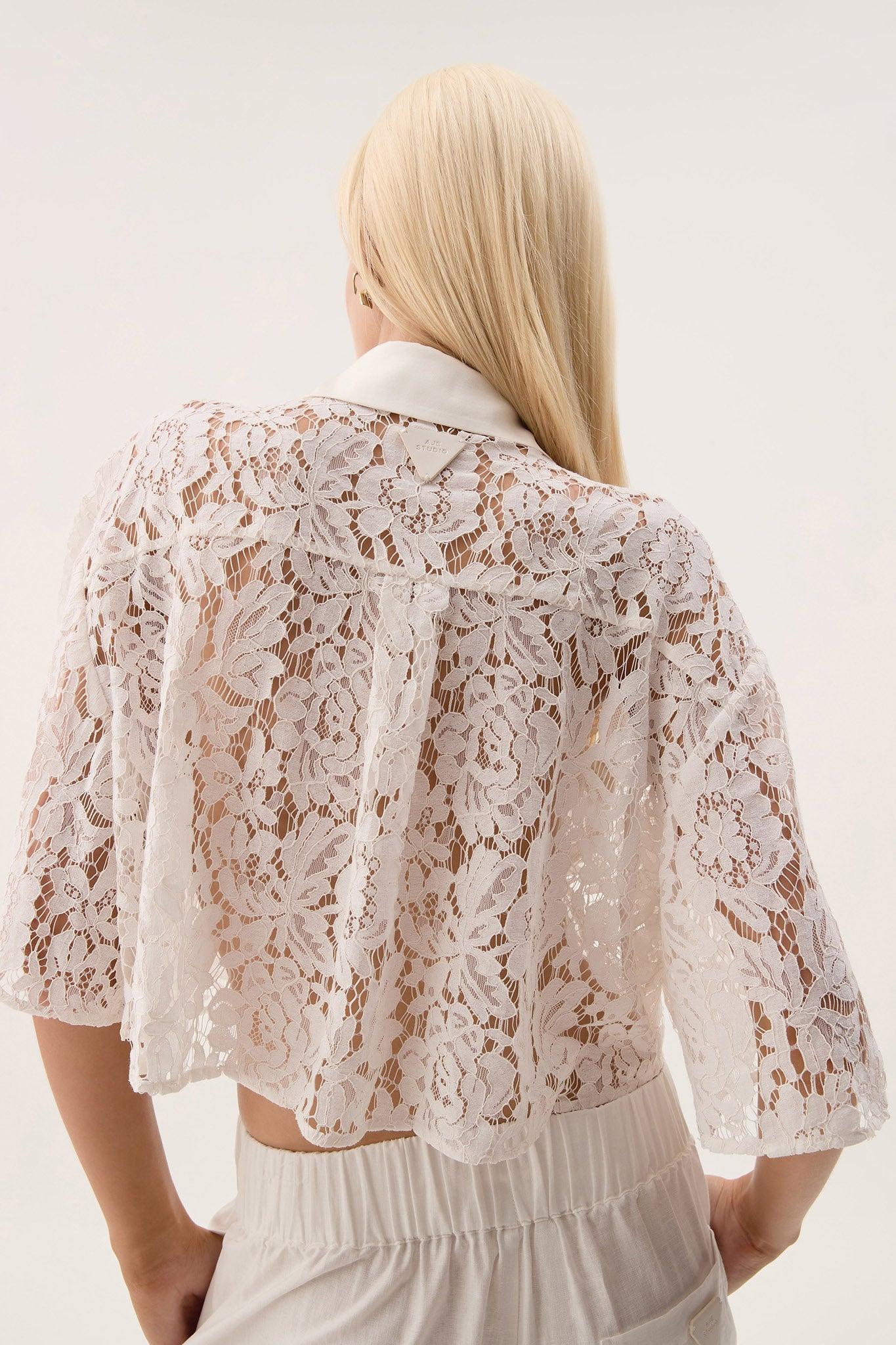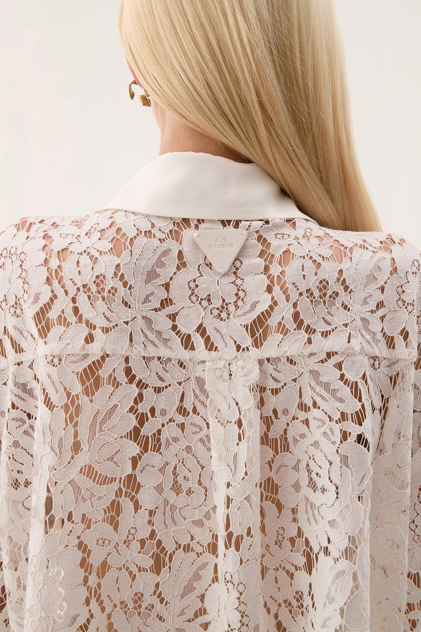 PRODUCT DETAILS Aje Studio Kosmo Lace Shirt Cropped lace shirt Contrast collar, placket and chest pockets 1/2 sleeves Curved hem Embossed vegan leather logo patch at back 60% Cotton 35% Polyamide 5% Viscose Dry Clean or Delicate Cold Hand Wash Separately Shop All Tops SIZE AND FIT Serena wears a size AU 8/S and is 178cm/5'10"