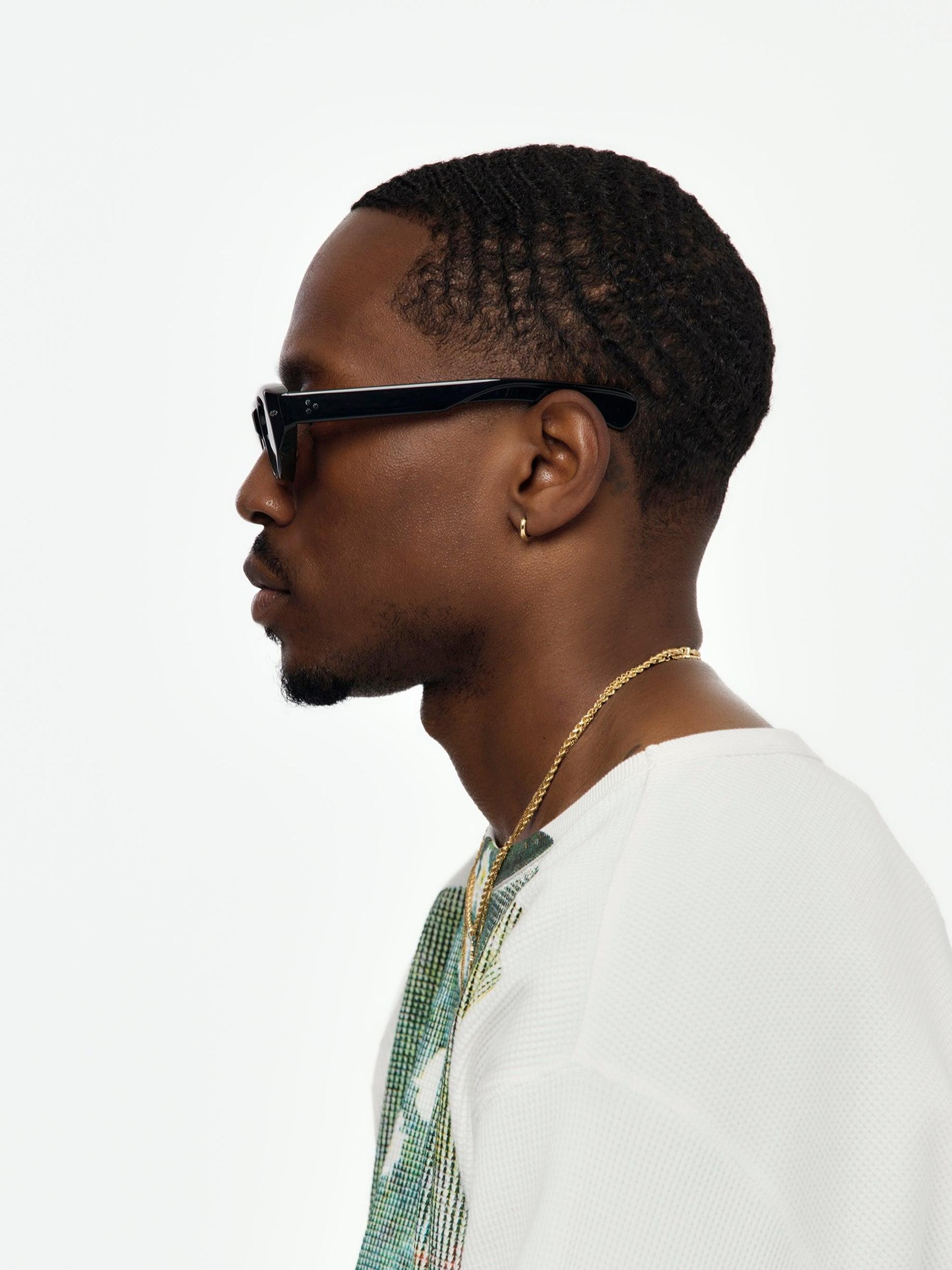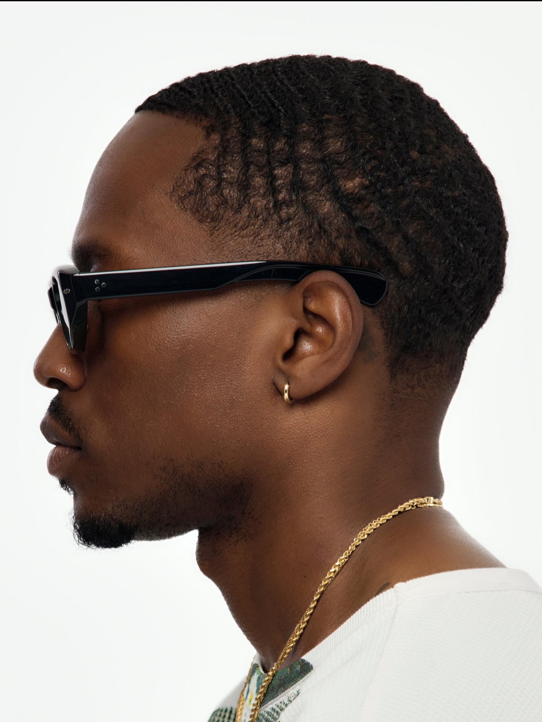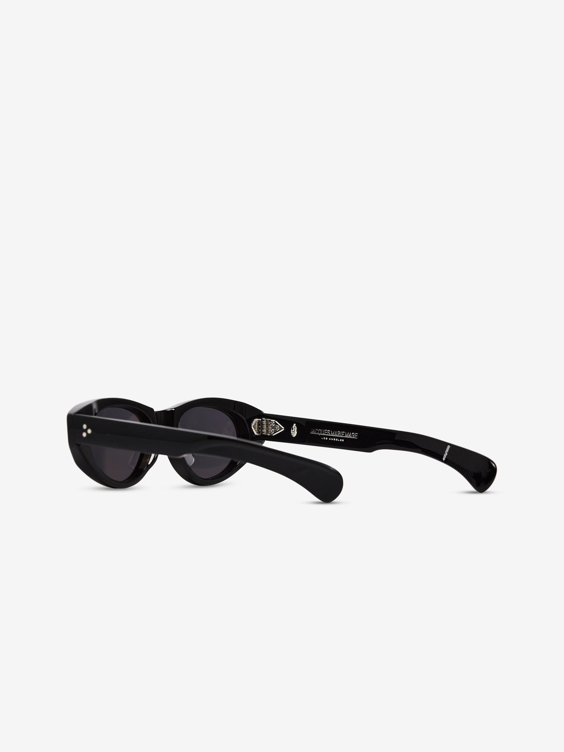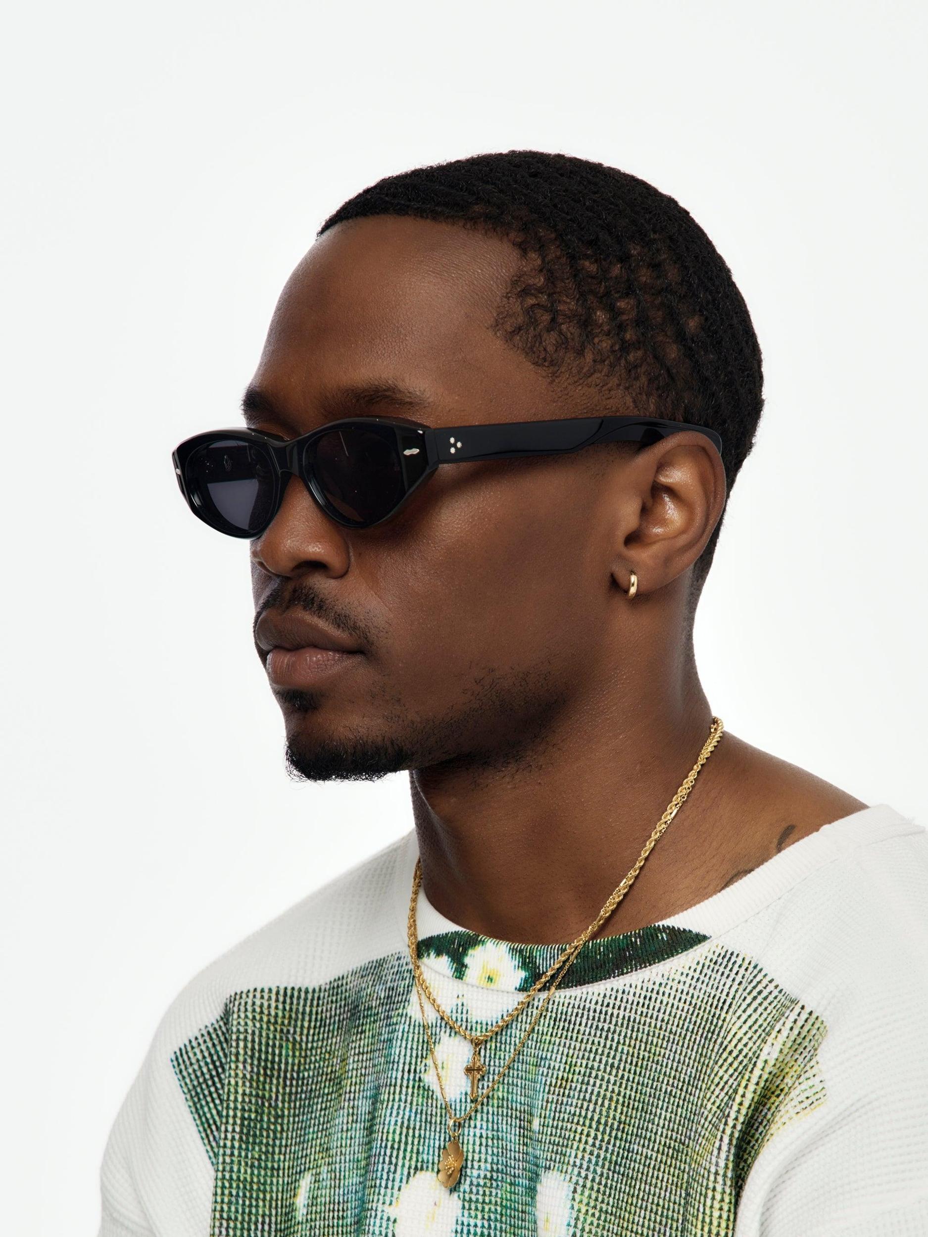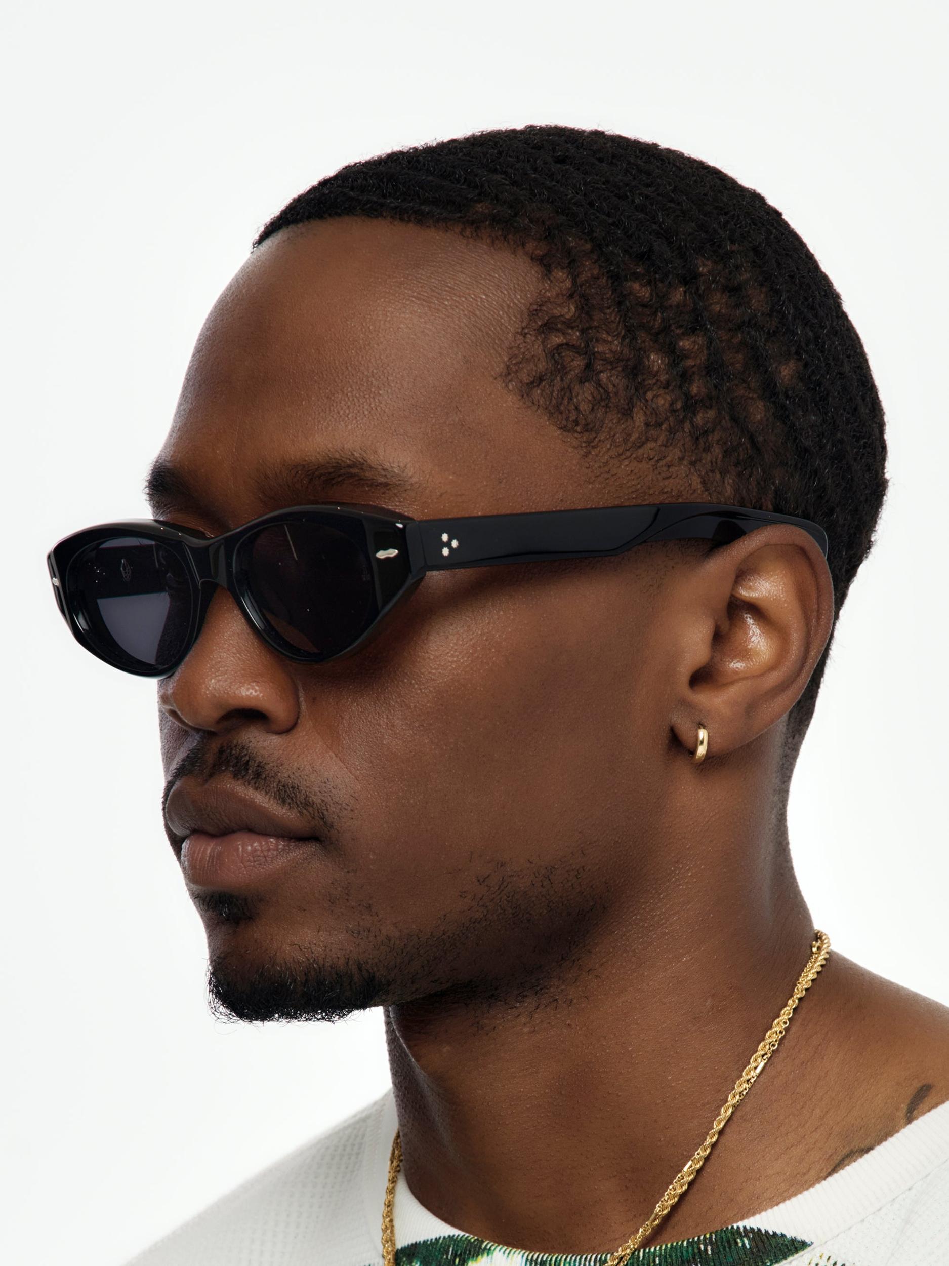 BLACK 10MM CURED CELLULOSE ACETATE FRAME WITH CUSTOM DOUBLE LAMINATED ACETATE TEMPLES FEATURING PRECIOUS METAL HARDWARE AND BLACK LENSES SILVER DOUBLE-ARROWHEAD FRONT PIN HIDDEN SILVER LEVER WIRECORE SILVER TENSION-SECURED CUSTOM 7 BARREL HAIRLINE HINGE JET CR39 4 BASE LENSES WITH BACKSIDE ANTI-REFLECTIVE TREATMENT FRAME SHAPE: CAT EYE 100% UV PROTECTION