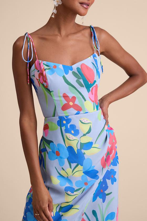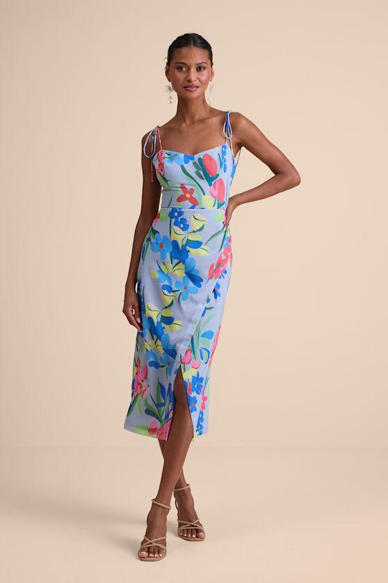 RSVP like a total sweetheart with this figure-skimming midi dress, crafted from airy woven fabric with a playful floral print. Slender, tying shoulder straps support the column silhouette, finished with a flattering V-neckline and an overlapping skirt that creates a front slit effect for effortless movement. Smocking and hidden zipper/clasp at the back.