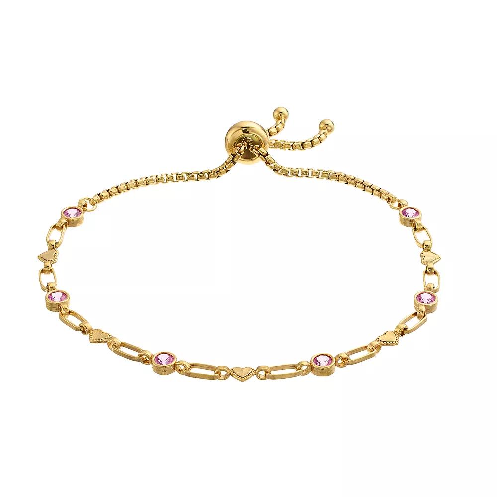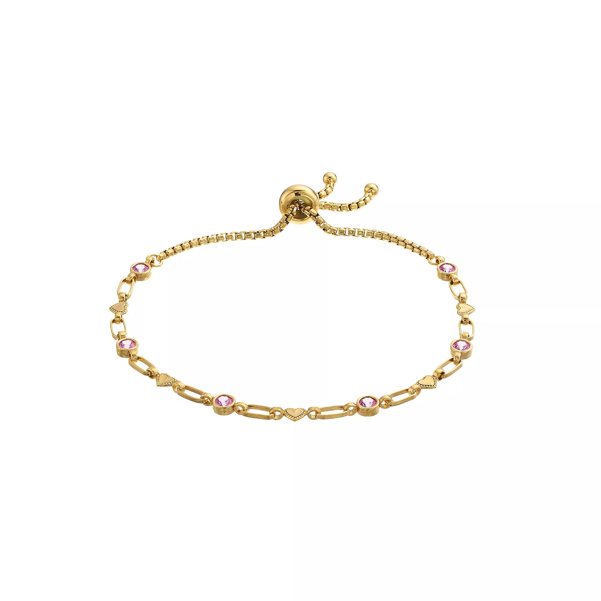 Alternating lab-created pink sapphires and heart links combine to make this Kristen Kesho bolo bracelet a charming complement to your wardrobe. Alternating lab-created pink sapphires and heart links combine to make this Kristen Kesho bolo bracelet a charming complement to your wardrobe. Length: adjusts up to 9.5 in. Nickel free Metal: sterling silver Finish: diamond-cut Packaging: boxedSTONE DETAILS Stone type: lab-created pink sapphire Total weight: 5/8 ct. Stone size: 3 mm Shape: round Setting: bezel Gemstones may have been treated to enhance their appearance. Special care may be required. Please visit our Gemstone Treatment & Special Care Guide for more information. Size: 9.50. Color: Yellow. Gender: female. Age Group: adult.