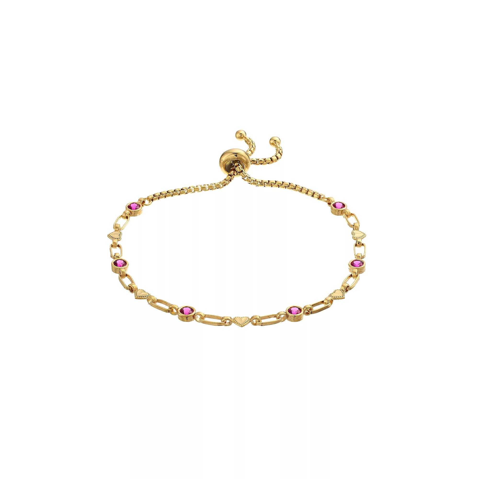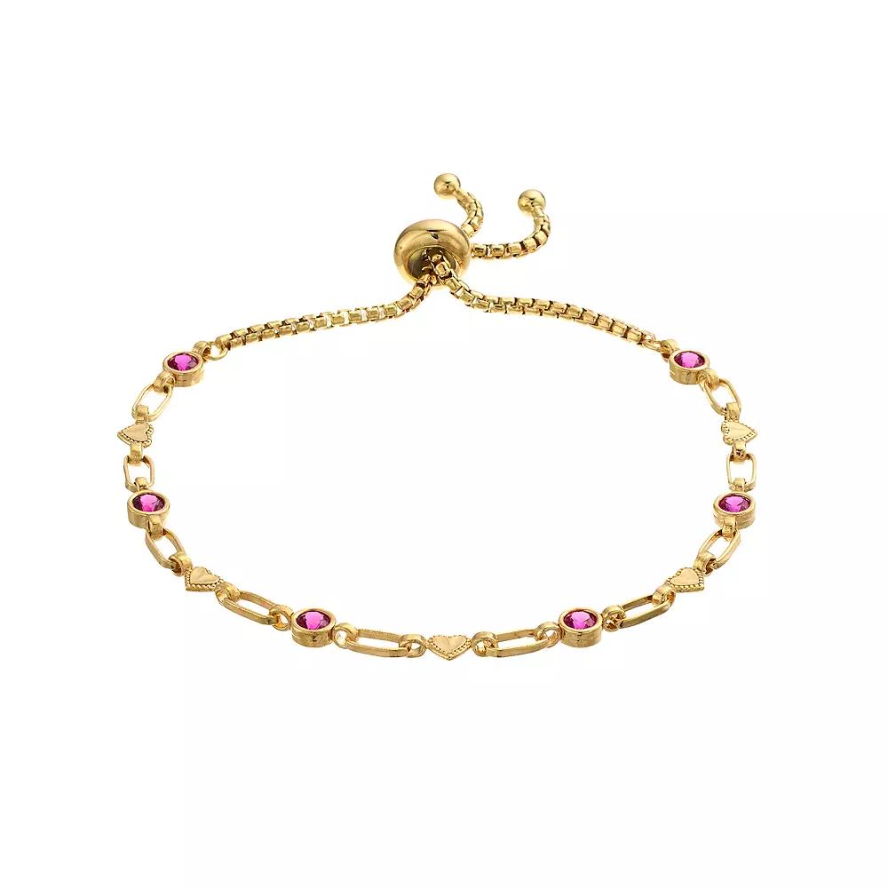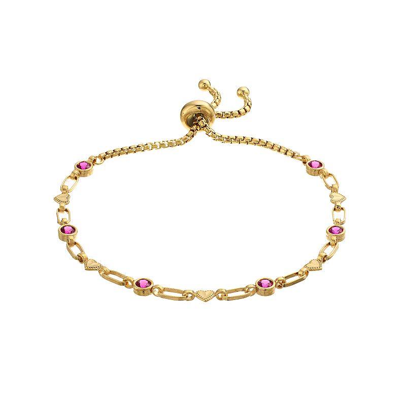 Alternating lab-created rubies and heart links combine to make this Kristen Kesho bolo bracelet a charming complement to your wardrobe. Alternating lab-created rubies and heart links combine to make this Kristen Kesho bolo bracelet a charming complement to your wardrobe. Length: adjusts up to 9.5 in. Nickel free Metal: sterling silver Finish: diamond-cut Packaging: boxedSTONE DETAILS Stone type: lab-created ruby Total weight: 5/8 ct. Stone size: 3 mm Shape: round Setting: bezel Gemstones may have been treated to enhance their appearance. Special care may be required. Please visit our Gemstone Treatment & Special Care Guide for more information. Size: 9.50. Color: Yellow. Gender: female. Age Group: adult.