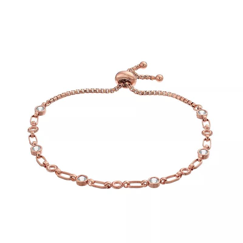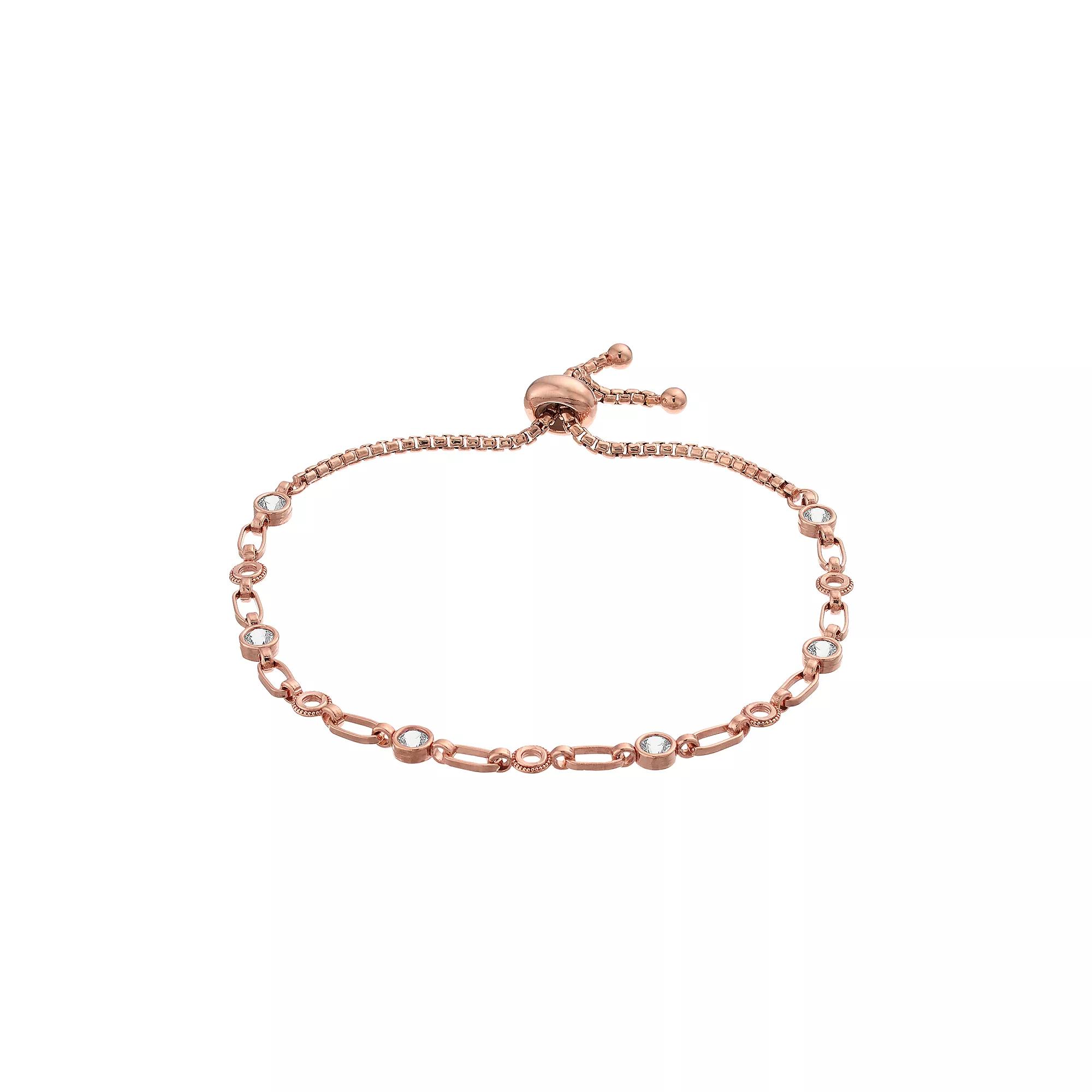 Adorned with brilliant-cut, lab-created white sapphires, this Kristen Kesho bolo bracelet sparkles and shines as it sits perfectly on the wrist. Adorned with brilliant-cut, lab-created white sapphires, this Kristen Kesho bolo bracelet sparkles and shines as it sits perfectly on the wrist. Length: adjusts up to 9.5 in. Nickel free Metal: sterling silver Finish: diamond-cut Packaging: boxedSTONE DETAILS Stone type: lab-created white sapphire Total weight: 5/8 ct. Stone size: 3 mm Shape: round Setting: bezel Gemstones may have been treated to enhance their appearance. Special care may be required. Please visit our Gemstone Treatment & Special Care Guide for more information. Size: 9.50. Color: Rose Tone. Gender: female. Age Group: adult.
