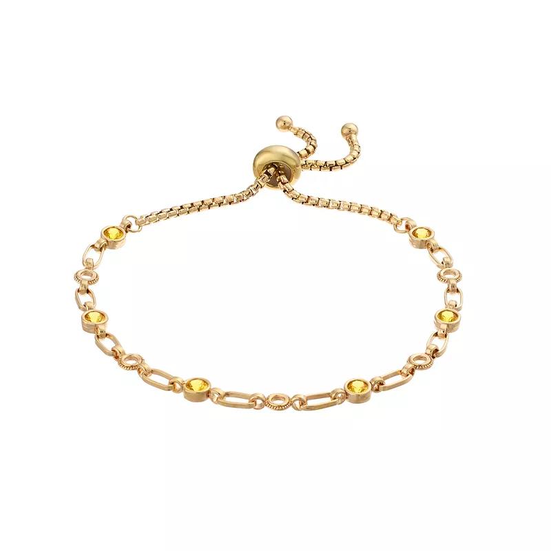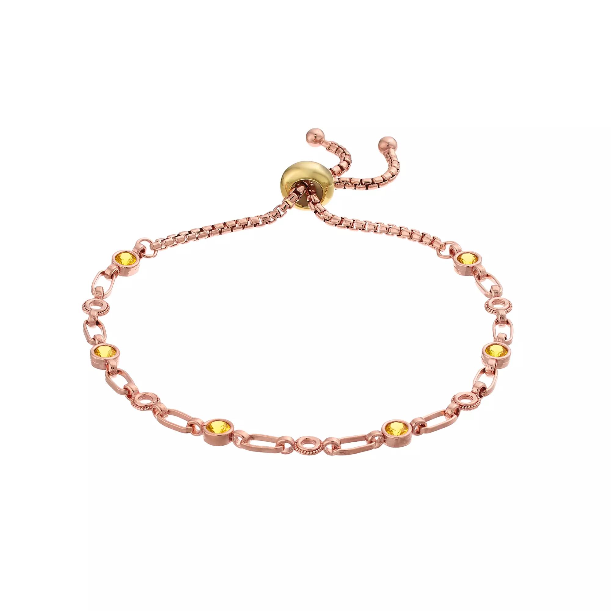 Adorned with brilliant-cut, lab-created yellow sapphires, this Kristen Kesho bolo bracelet sparkles and shines as it sits perfectly on the wrist. Adorned with brilliant-cut, lab-created yellow sapphires, this Kristen Kesho bolo bracelet sparkles and shines as it sits perfectly on the wrist. Nickel Free Metal: sterling silver Length: adjusts up to 9.5 in. Plating: 18k gold, 18k rose gold, rhodium Packaging: boxed Finish: polishedSTONE DETAILS Stone type: lab-created yellow sapphire Stone size: 3 mm Shape: round Setting: bezel Gemstones may have been treated to enhance their appearance. Special care may be required. Please visit our Gemstone Treatment & Special Care Guide for more information. Size: 9.50. Color: Rose Tone. Gender: female. Age Group: adult.