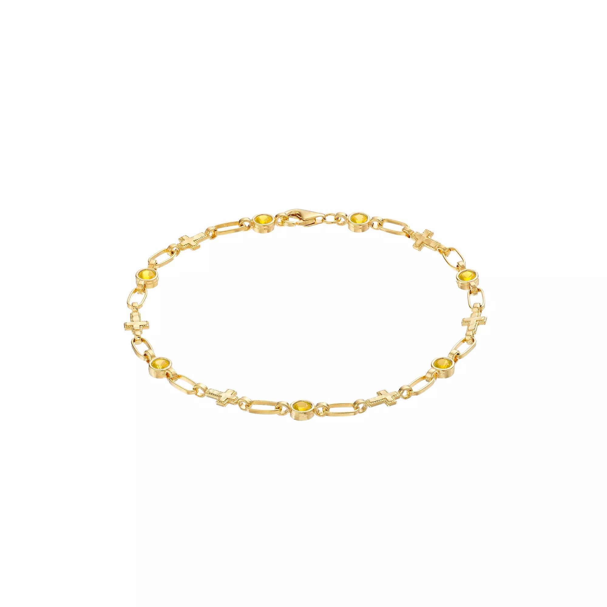 Adorned with cheerful lab-created yellow sapphires and textured cross links, this sterling silver Kristen Kesho bracelet is a lovely way to display your faith each and every day. Adorned with cheerful lab-created yellow sapphires and textured cross links, this sterling silver Kristen Kesho bracelet is a lovely way to display your faith each and every day. Length: 7.5 in. Clasp: lobster claw Metal: sterling silver Finish: diamond cut, polished Packaging: boxedSTONE DETAILS Stone type: lab-created yellow sapphire Total weight: 1 ct. Shape: round Setting: bezel Gemstones may have been treated to enhance their appearance. Special care may be required. Please visit our Gemstone Treatment & Special Care Guide for more information. Please note, due to the high value of this item, a signature may be required upon delivery. Size: 7.5. Gender: female. Age Group: adult.