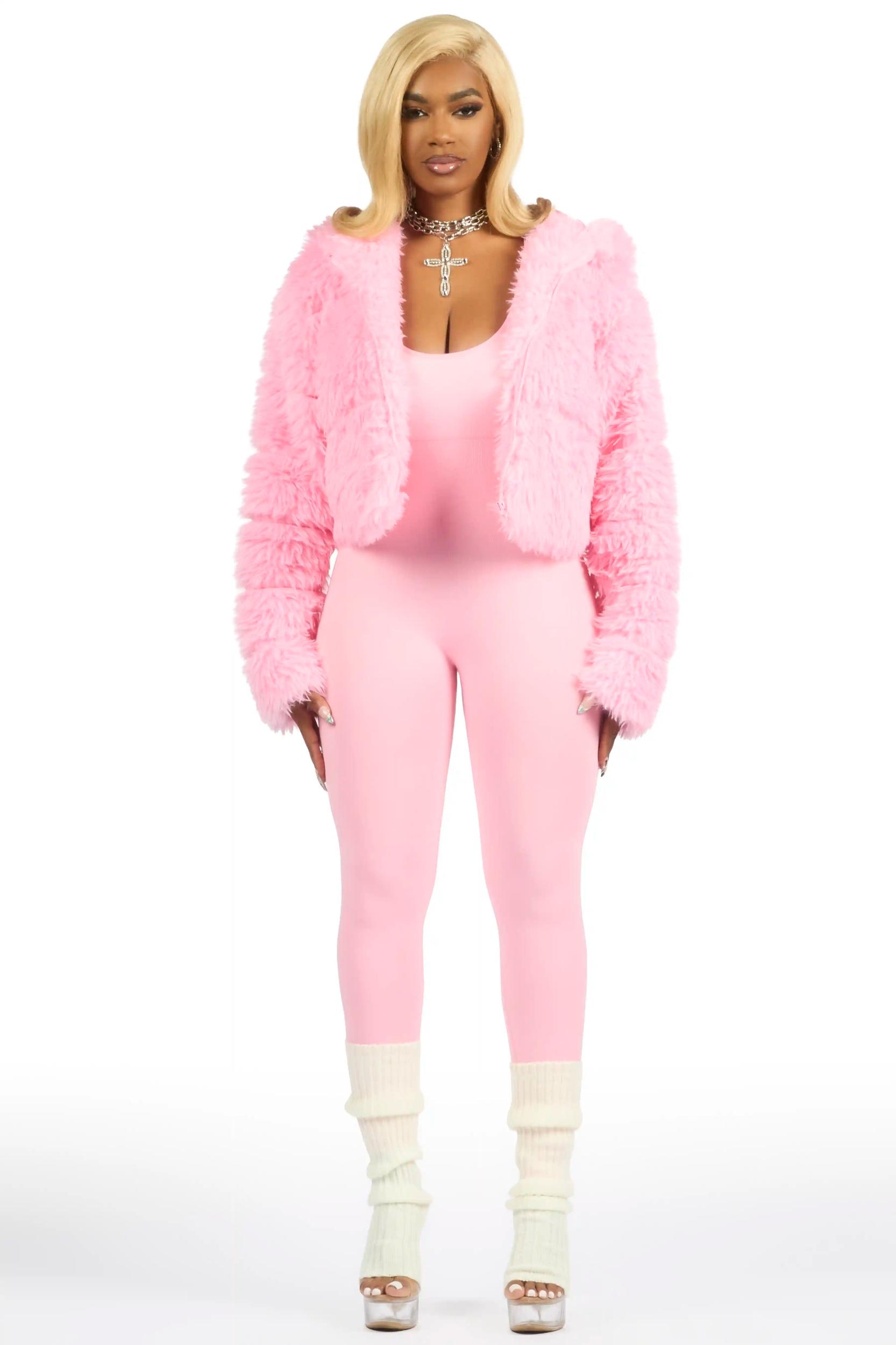 An urban fur jacket for women in baby blue. Designed with an ultra soft faux fur exterior and lightweight interior for optimal warmth. Hooded neckline Full front zip closure Cropped fit Ultra soft faux fur fabric Long sleeves