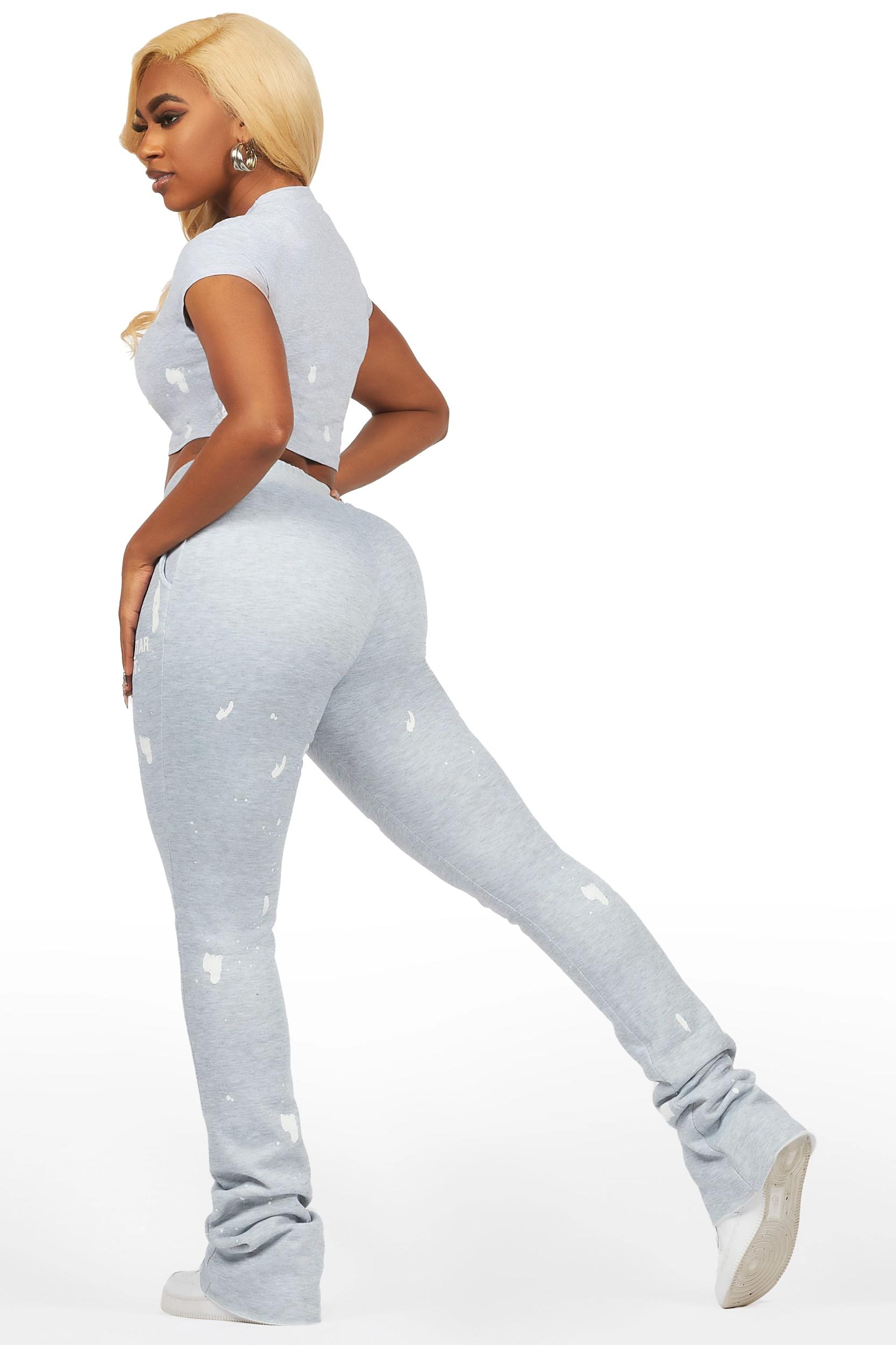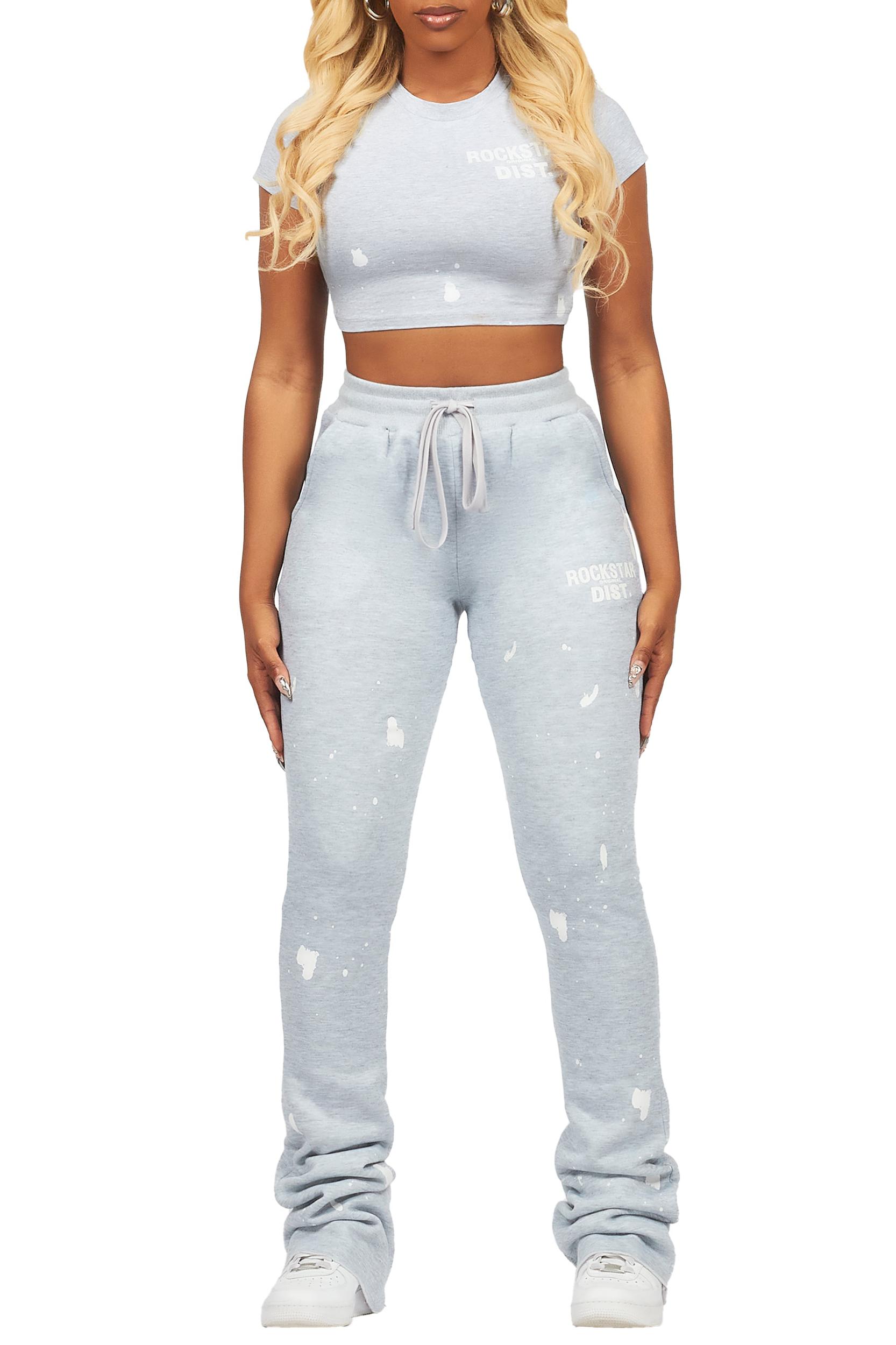 A two-piece tee and super stack lounge pant set for women in heather grey. Designed with ultra soft organic cotton for the perfect athleisure set. Rounded neckline Short sleeves Regular-fit Drawstring waistband Dual slant zip pockets Printed RSO logos Custom paint splatter Super stacked construction Flare leg openings 42" inseam