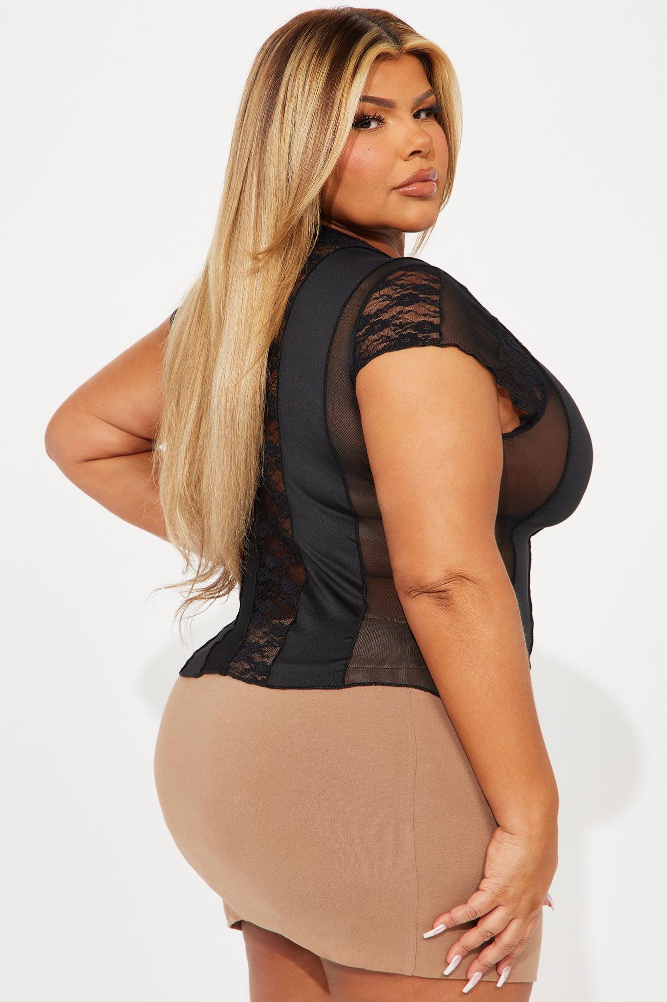 Available In Black. Round Neck Lace And Mesh Cut Out Short Sleeve Fitted Seaming Detail Self: 92% Nylon 8% Spandex Contrast 1/ 2: 95% Polyester 5% Spandex Imported