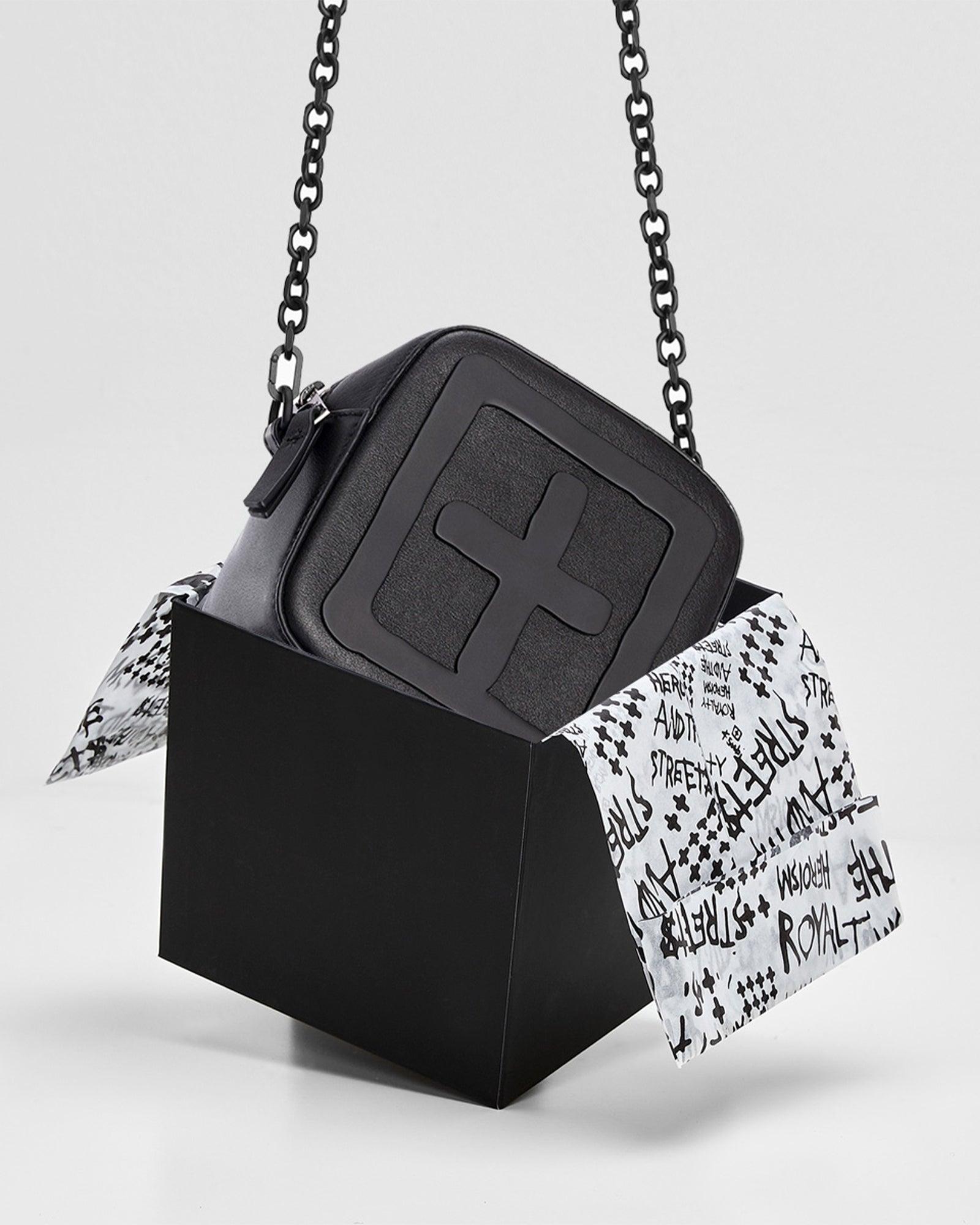 The Kube Mini Bag is made of milled calf leather in a black colourway. This bag features main compartment with zip fastening, easy access phone sleeve at the back and two detachable shoulder strap options: both a nylon webbing shoulder strap with Sign of The Times print and matte gunmental chain. It also features T-box logo embossed on the front, custom Ksubi cross lining and branded hardware.Care instructions: Store in Ksubi custom care bag to help maintain shape and absorb humidity. Protect from direct light, heat and rain. Should your tote become wet, dry it immediately with a soft cloth. Do not carry heavy products that may affect the shape of the bag. Clean with a soft, dry cloth.
