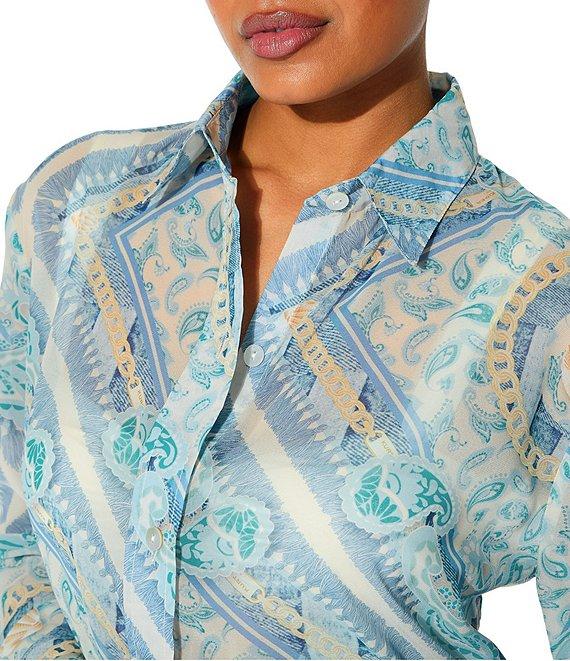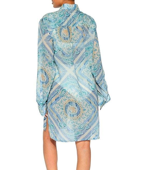 From Kurt Geiger, this swim cover-up features: Shirt dress silhouette Denim chain print Point collar neckline Long sleeves with button cuffs Unlined Straight side slit hemline Button front closure Approx. 37" length Polyester Hand wash Imported.