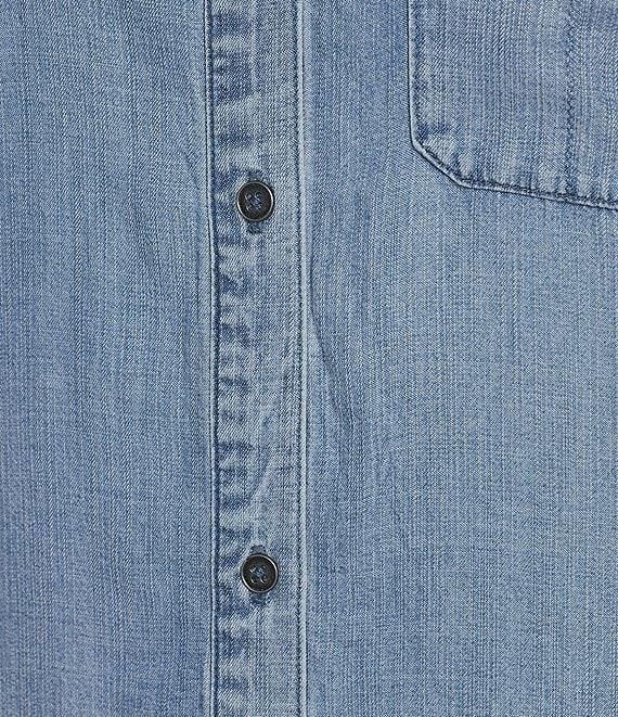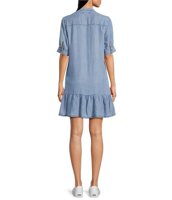 From KUT from the Kloth, this dress features: Denim fabrication Stand collar Short sleeves with wide cuffs Front chest pocket Ruffle hemline Button down closure Approx. 34.5" length Lyocell Machine wash Imported.