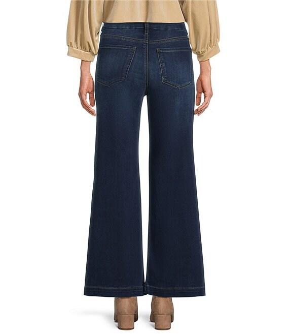 From KUT from the Kloth, these jeans feature: Stretch denim fabrication Wide leg silhouette High rise waist Belt loops Flat front silhouette Two front patch and two back patch pockets Ankle length Front button and zipper closure Approx. 29" inseam; 24" leg opening; front rise: 10.25" Cotton/lyocell/polyester/spandex Machine wash Imported.