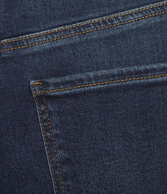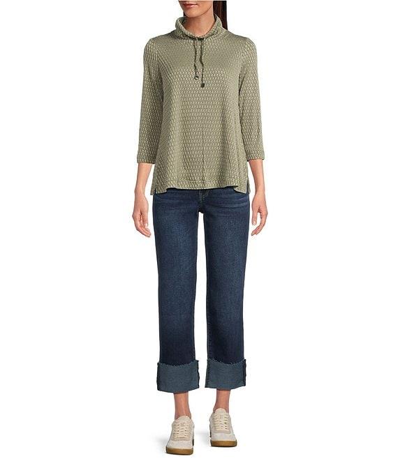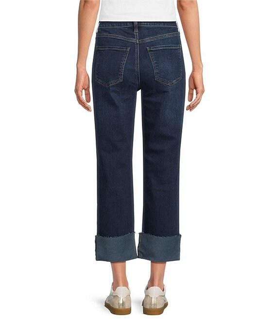 From KUT from the Kloth Petite, these jeans feature: Denim fabrication High rise Straight leg Belt loops 5 pocket style Rolled up cuffs Raw rolled hem Front zipper and button closure Approx. 26" rolled cuff, 30" unrolled cuff Cotton/polyester/spandex Machine wash cold/tumble dry low Imported.