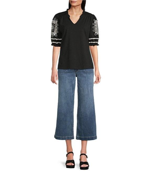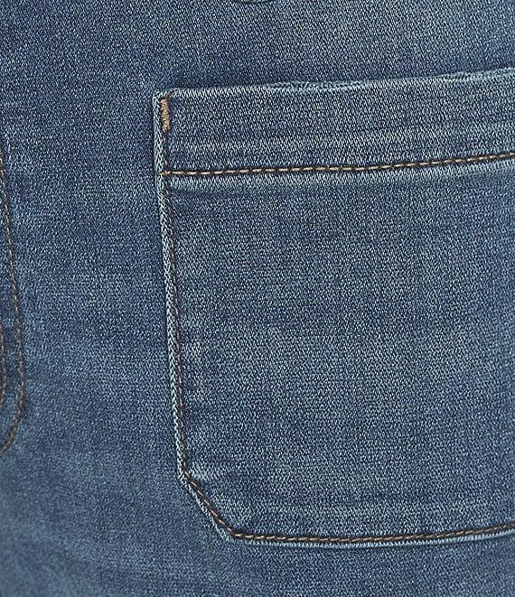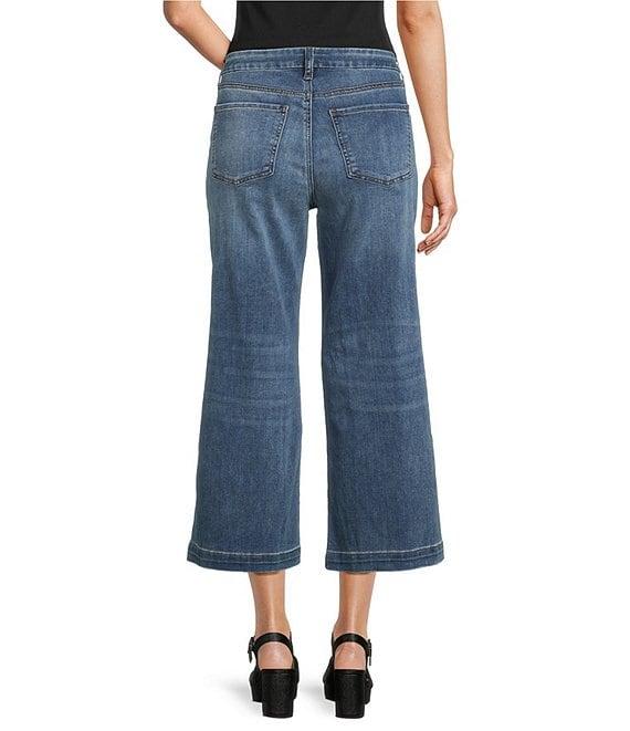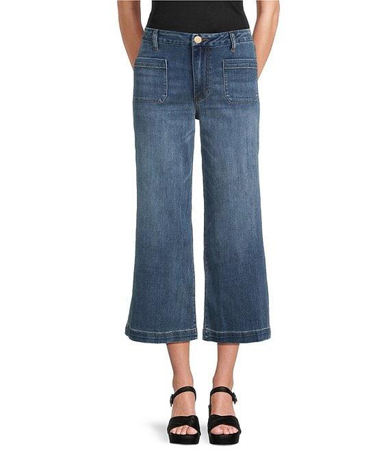 From KUT from the Kloth Petite, these jeans feature: Stretch denim fabrication Wide-leg silhouette High rise Patch pockets Belt loops Relaxed fit Finished hemline Button/zip fly closure Approx. 25.75" inseam, 10.25" rise Cotton/lyocell/polyester/spandex Machine wash cold/tumble dry low Imported.