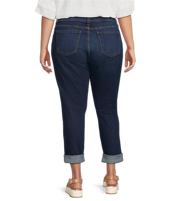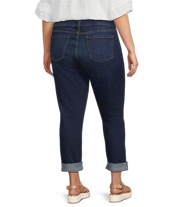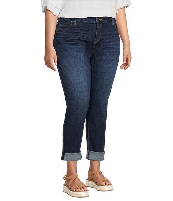 From KUT from the Kloth Plus, these jeans feature: Stretch denim fabrication Boyfriend silhouette Belt loops 5 pocket style Rolled up hemline Front zipper and button closure Approx. 26" rolled cuff, 30" unrolled cuff, 15" leg opening Cotton/polyester/elastane Machine wash cold/tumble dry low Imported.