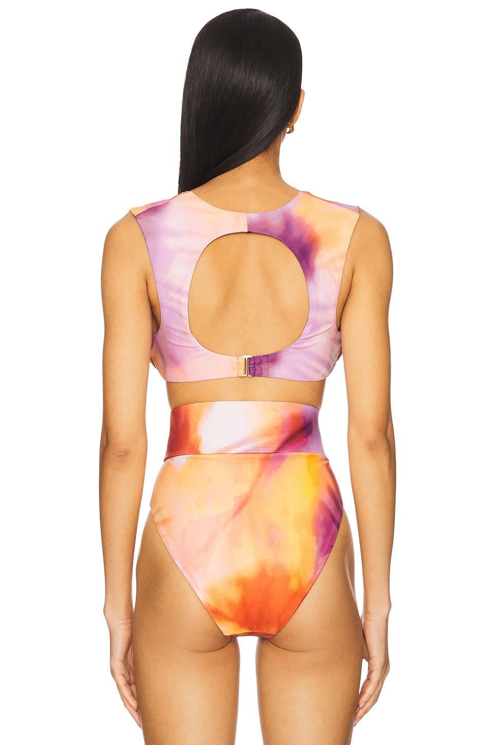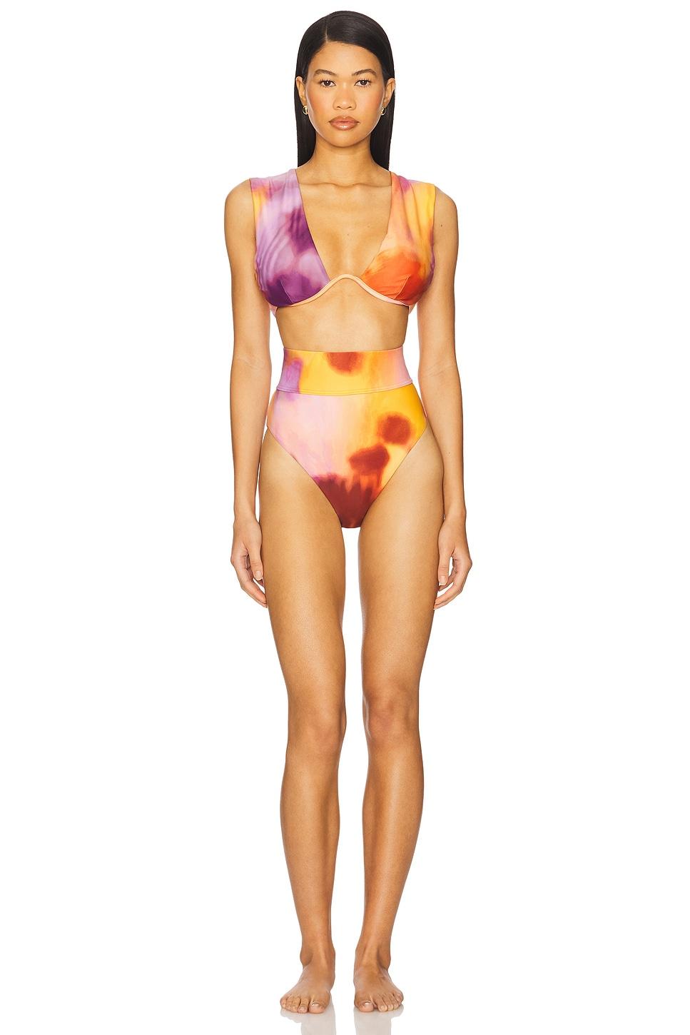 Shell: 73% polyester, 27% spandexLining: 90% polyester, 10% spandex. Machine wash recommended. Back clasp closure. Underwire bust. Removable padded cups. Midweight swimwear fabric. Item not sold as a set. Made in China. Revolve Style No. AIYA-WX72. Manufacturer Style No. S2132D-T.
