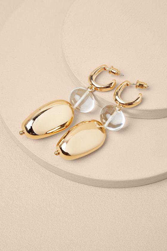 An updo and these attention-getting earrings are the perfect way to ensure an eventful, compliment-filled afternoon. Chic huggie-style posts support a clear stone-like bead and an oblong gold-toned charm, forming a statement-making drop silhouette that is bound to get you noticed.