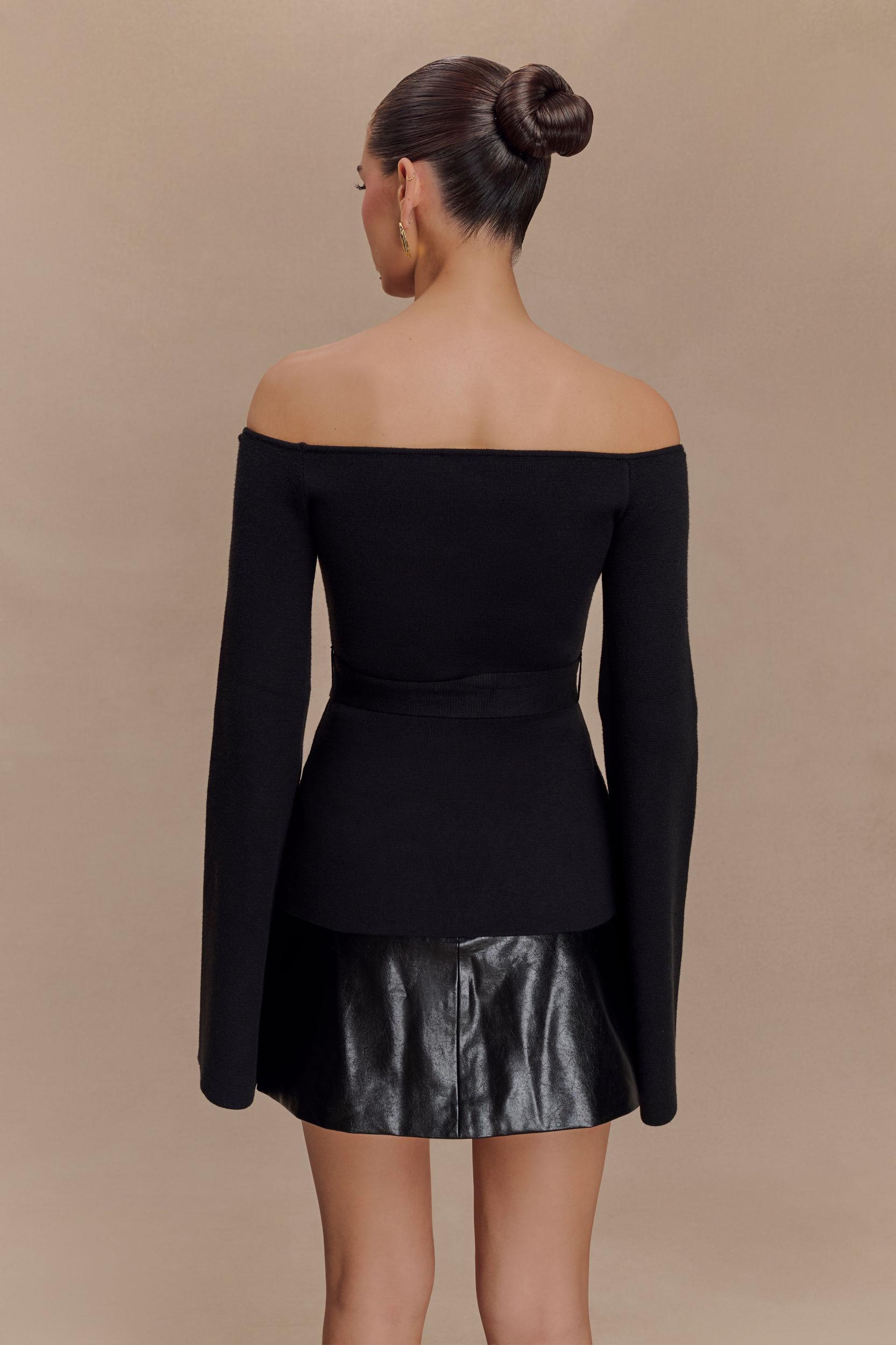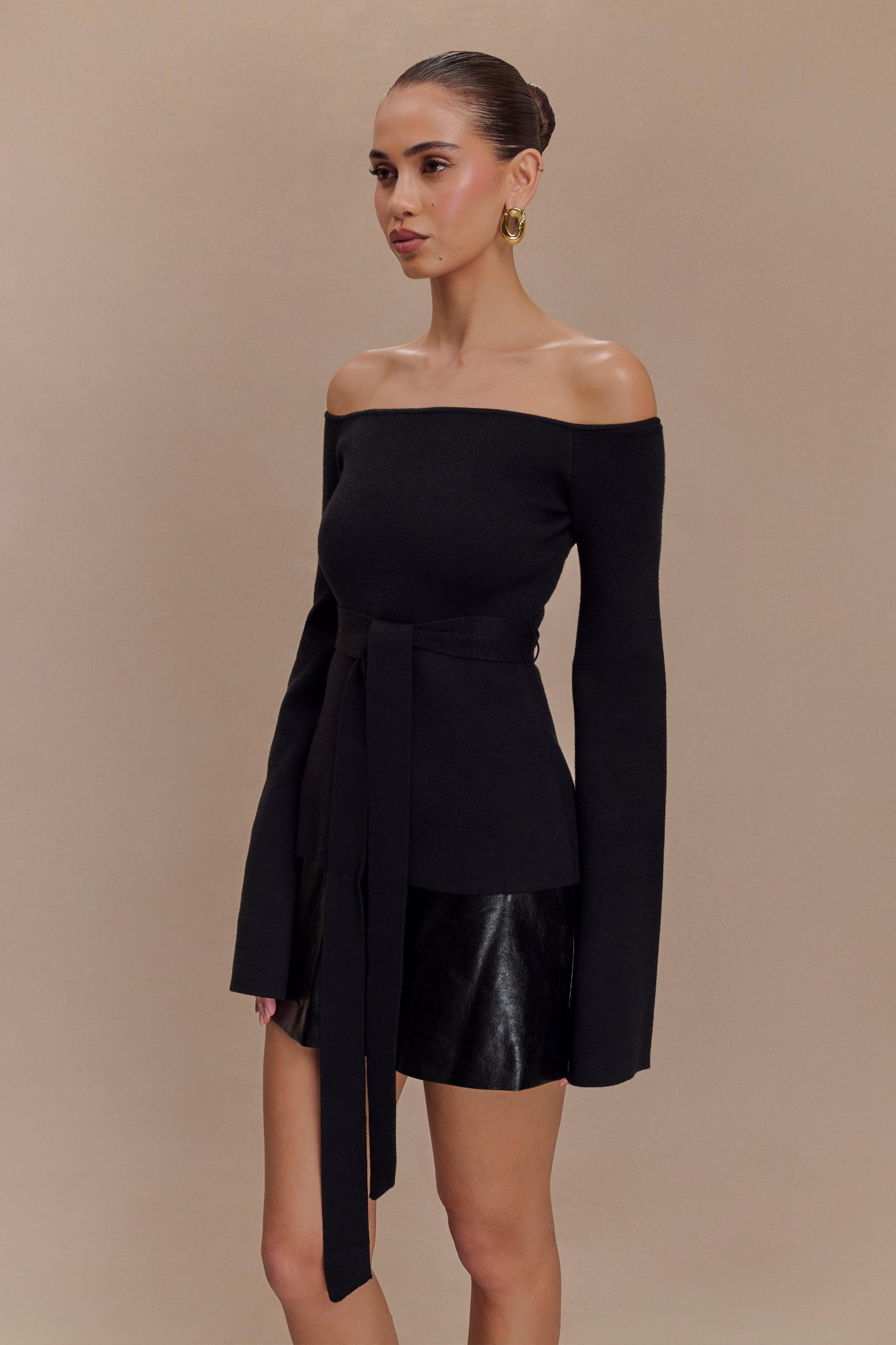 Chic, cozy, off-shoulder. Embrace effortless elegance with the KYLE Off Shoulder Knit Top, a chic and versatile addition to your wardrobe. Featuring a sophisticated Bardot neckline, this long-sleeve top highlights your shoulders for a timeless, feminine silhouette. The flared sleeve hems add a playful touch, while the longline design and waist tie create a flattering, cinched fit. Crafted from soft knit fabric and left unlined for a lightweight feel, this top is perfect for layering or styling on its own.