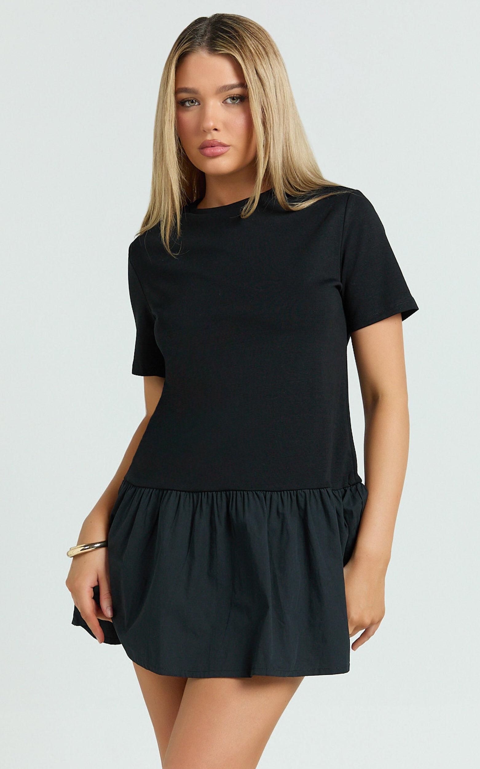 Crafted in classic black, this flirty style blends a casual tee-shirt top with an ultra-feminine drop waist and a fully gathered skirt, creating that chic hourglass silhouette we all love. From brunch dates with the girls to dancing until dawn, this dress has a laid-back yet playful feel, keeping you comfy while turning heads wherever you go.For an effortlessly stylish daytime look, pair it with sheer ankle socks and chunky boots. Prefer a bit more glam? Dress it up for the evening by adding delicate boho jewelry and strappy heels. However you style it, the Kym Mini Dress offers versatile outfit options, promising confidence and charm from day to night!Product Details:Zips featureFit & Flare stylePoplin fabricCrew necklineCasual wearMini lengthShort sleevesCotton material
