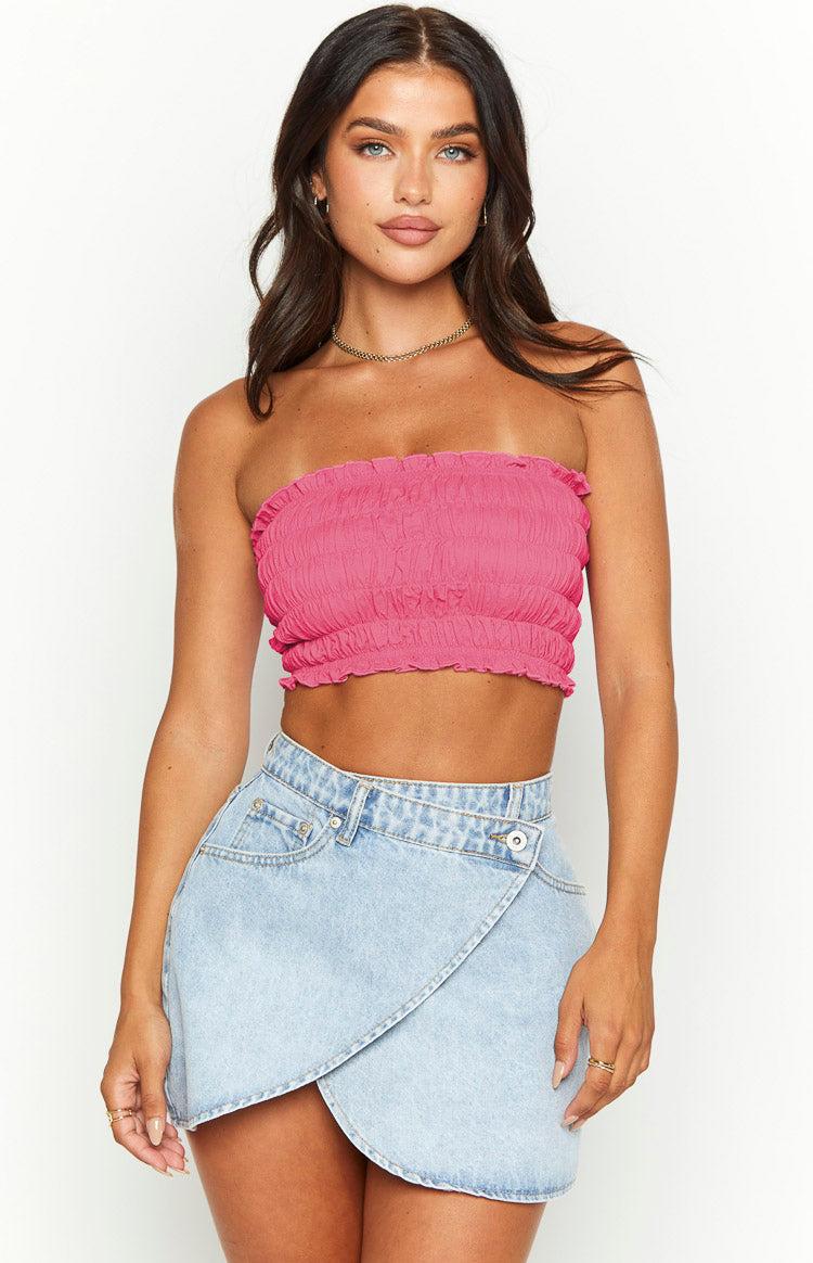 Pink Crop Top Channel your inner barbie with this gorg statement crop top! Super cute to add some flare to a pair of pants or mini skirt! Add some heels, jewellery and a bag and you're set to turn heads. Cropped length Ruched detailing Lettuce trim hem Strapless Lots of stretch Elasticated Light weight material Unlined