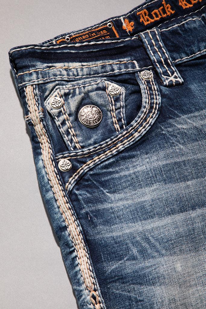 Silver hardware throughout with inverted Fleur de Lis pocket design. Embellished with leather, heavy stitching, and double 'RR' detail. Faux snake leather print belt loop patch. Designed with care and creativity in Los Angeles, California.