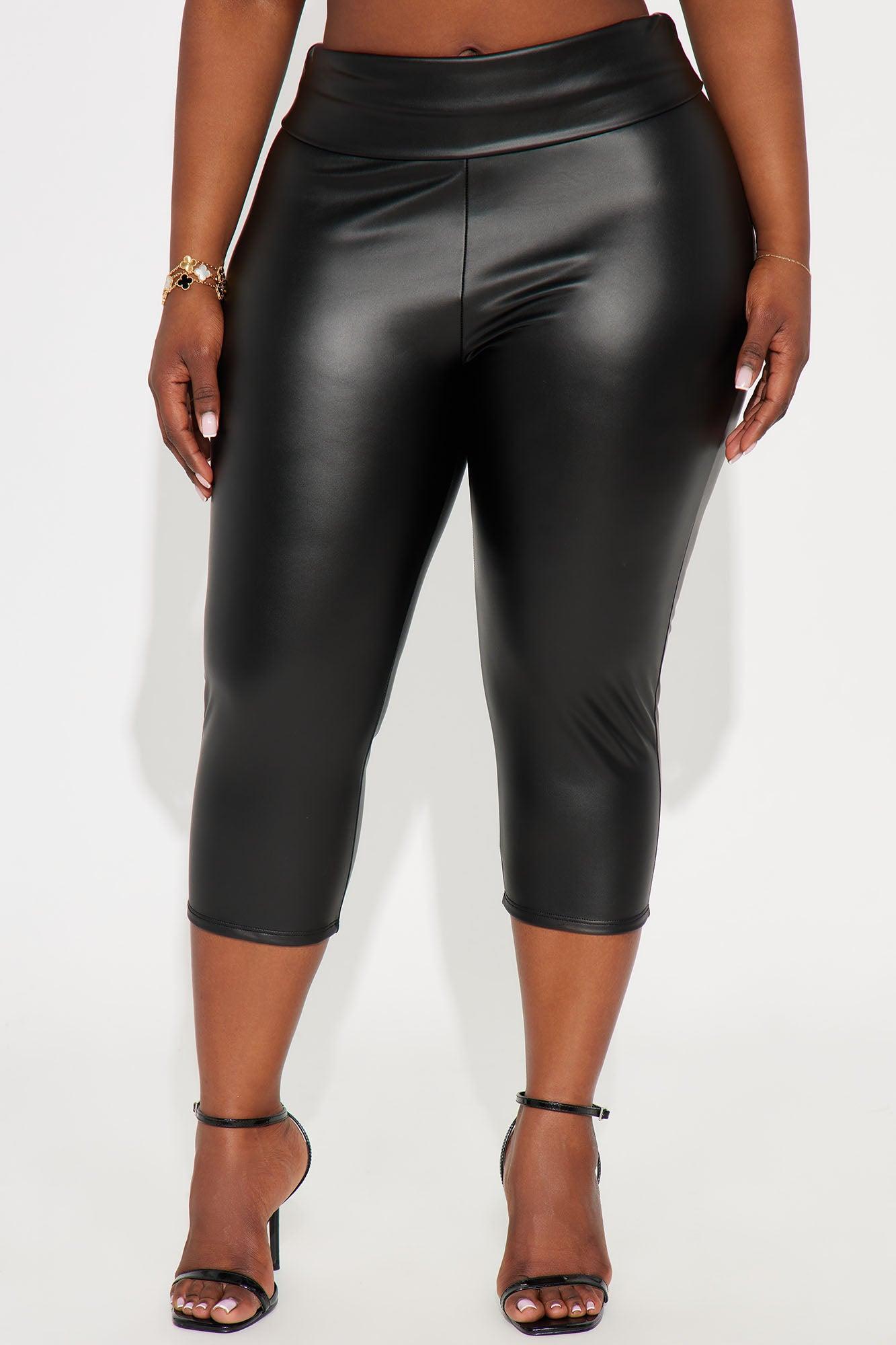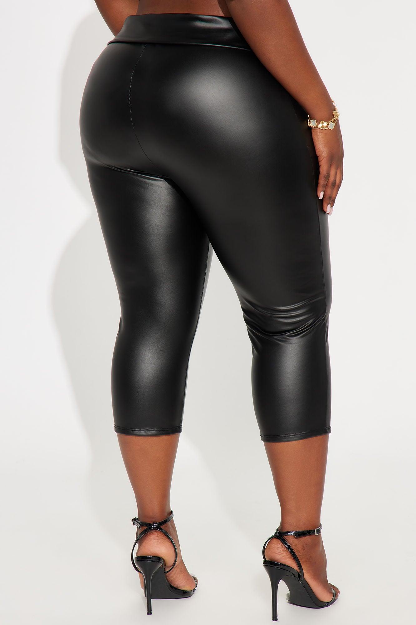 Available In Black. Faux Leather Capri Legging Stretch Cropped 19" Inseam High Rise Foldover Waistband Self: 95% Polyester 5% Spandex Imported California Proposition 65WARNING: Cancer and Reproductive Harm - www.P65Warnings.ca.gov.